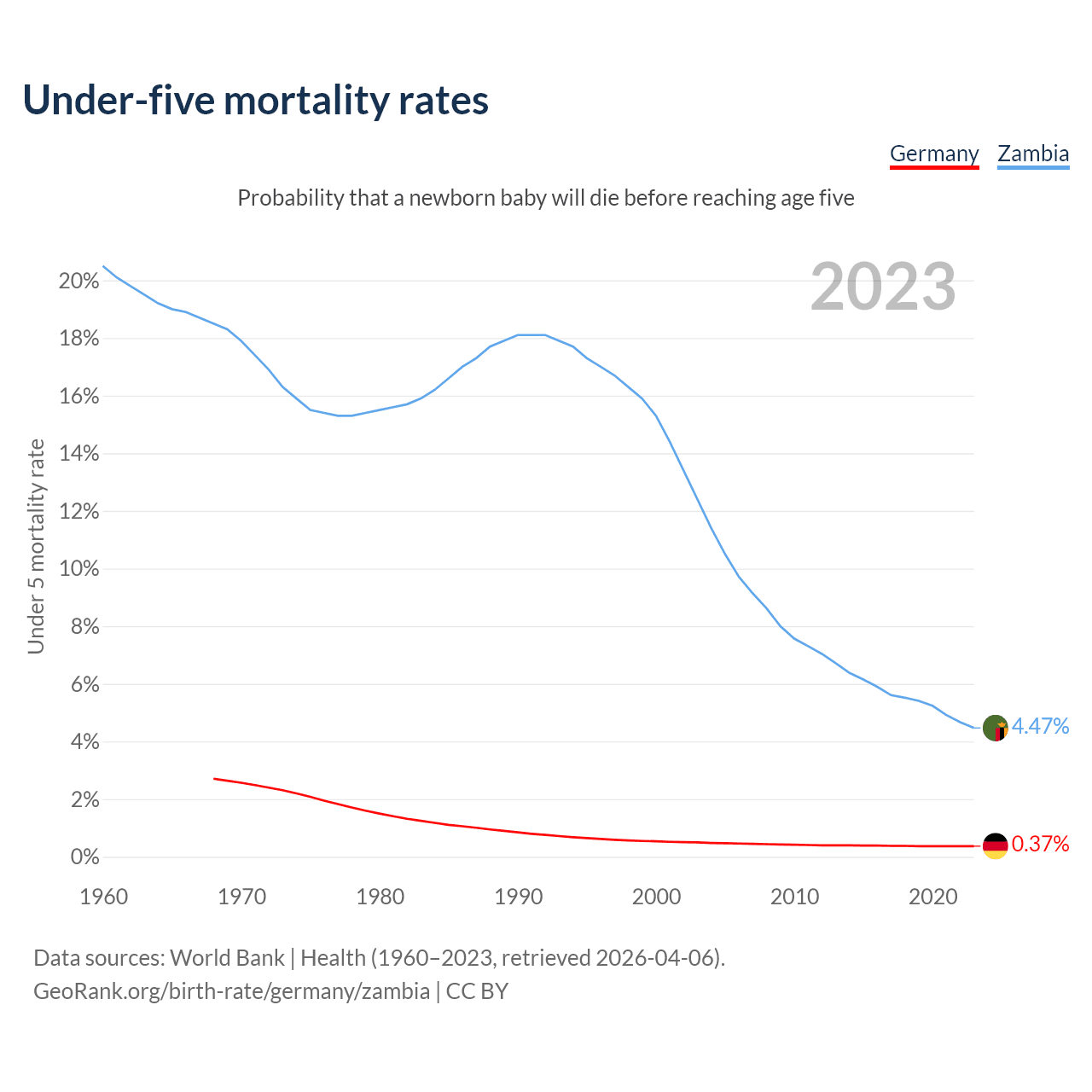 The chance that a newborn baby will die before reaching age five is 0.37% in Germany and 4.47% in Zambia. Above is a chart with historical data on under-five mortality rates.