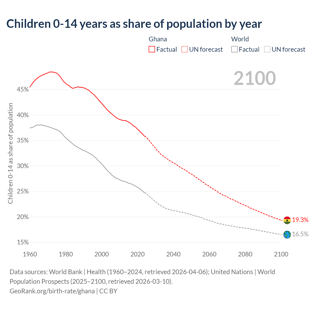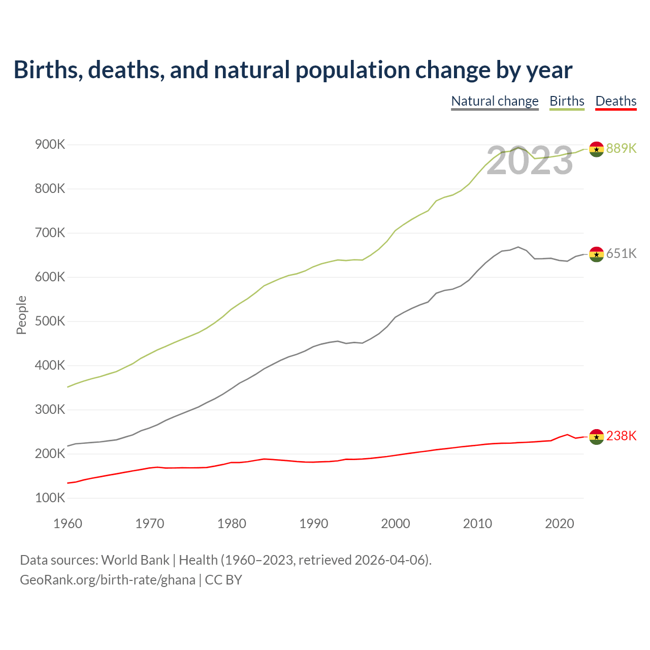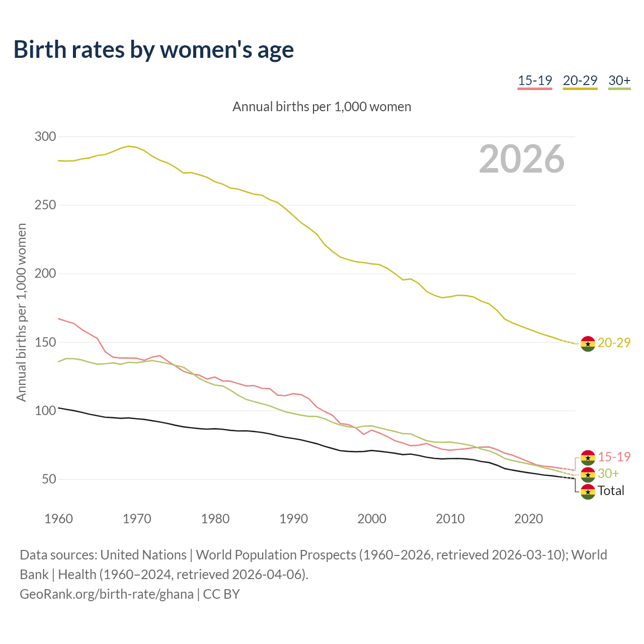 Ghana has a birth rate of 26.3 (annual births per 1,000 people) and a fertility rate of 3.4 (the average number of children a woman is expected to have over her lifetime based on current age-specific birth rates).