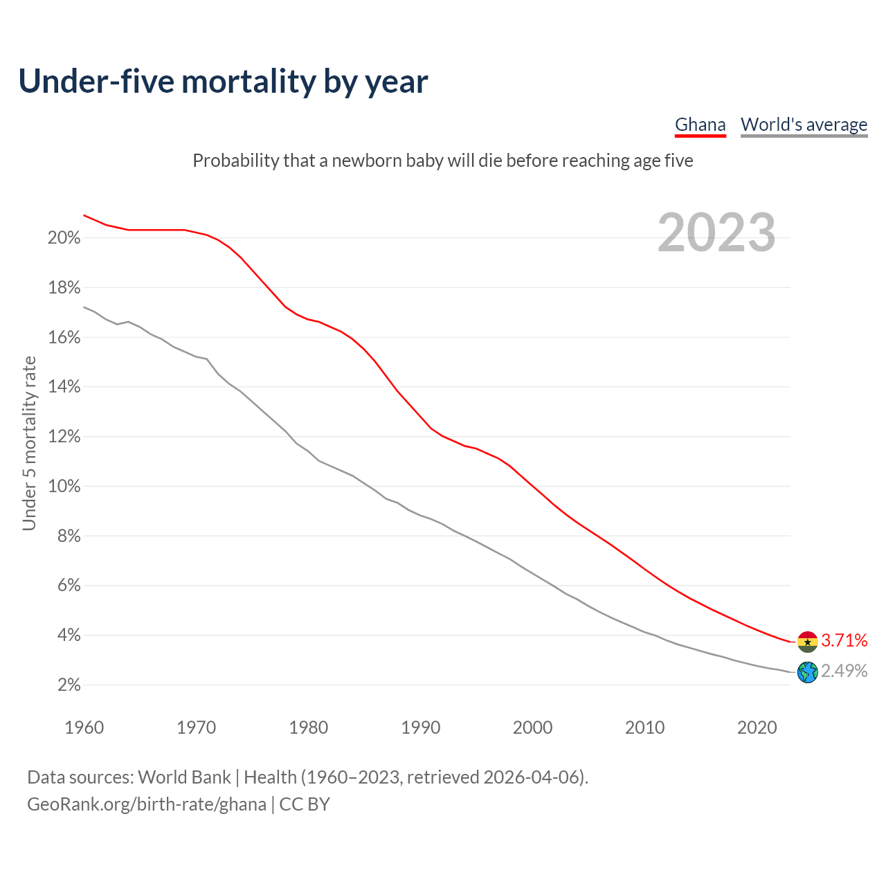The under-5 mortality rate in Ghana was 37.1 deaths per 1,000 live births in 2023 — a 3.71% chance that a newborn baby will die before reaching age five. This is down from 100.2 deaths per 1,000 live births in 2000.