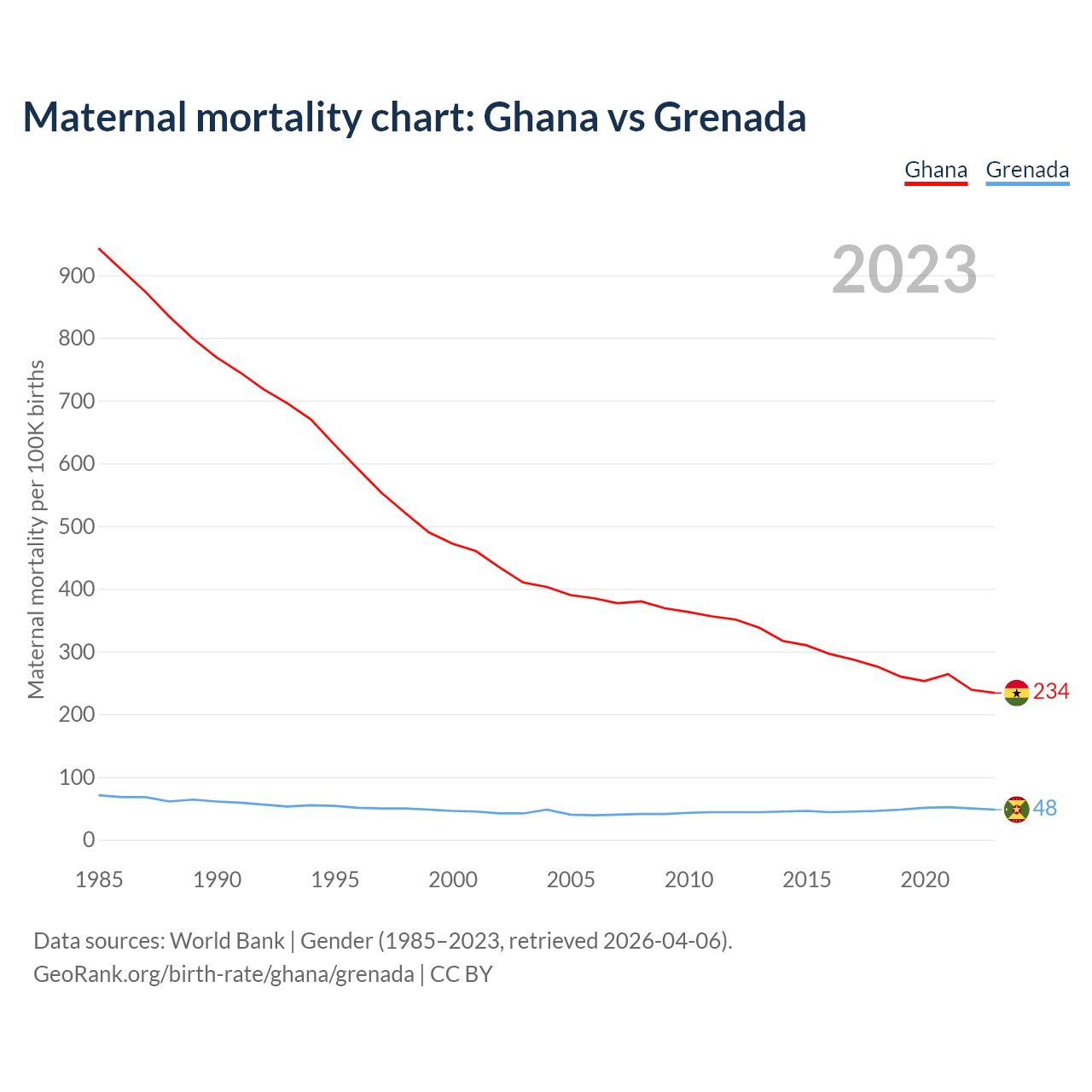 The maternal mortality rate, which is the probability of dying during childbirth or within 42 days of pregnancy termination, is 234 deaths per 100,000 live births in Ghana, compared to 48 deaths in Grenada.