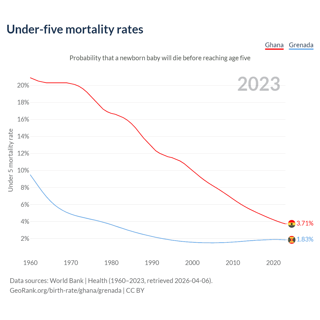 The chance that a newborn baby will die before reaching age five is 3.71% in Ghana and 1.83% in Grenada. Above is a chart with historical data on under-five mortality rates.