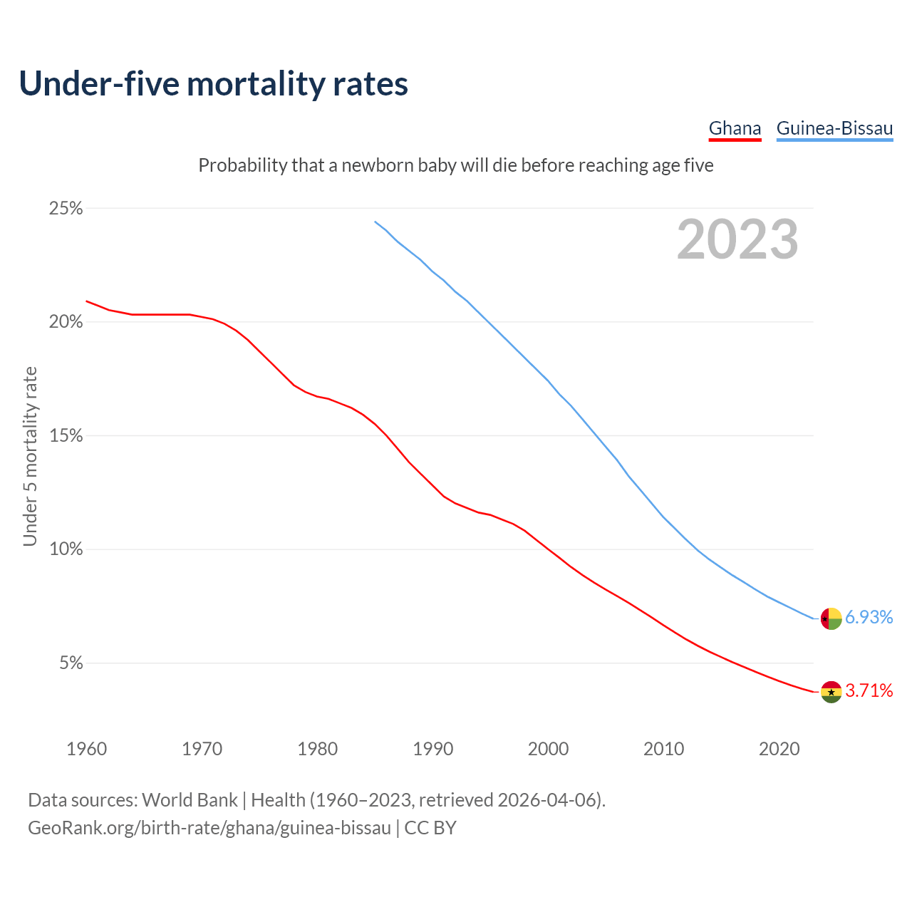The chance that a newborn baby will die before reaching age five is 3.71% in Ghana and 6.93% in Guinea-Bissau. Above is a chart with historical data on under-five mortality rates.