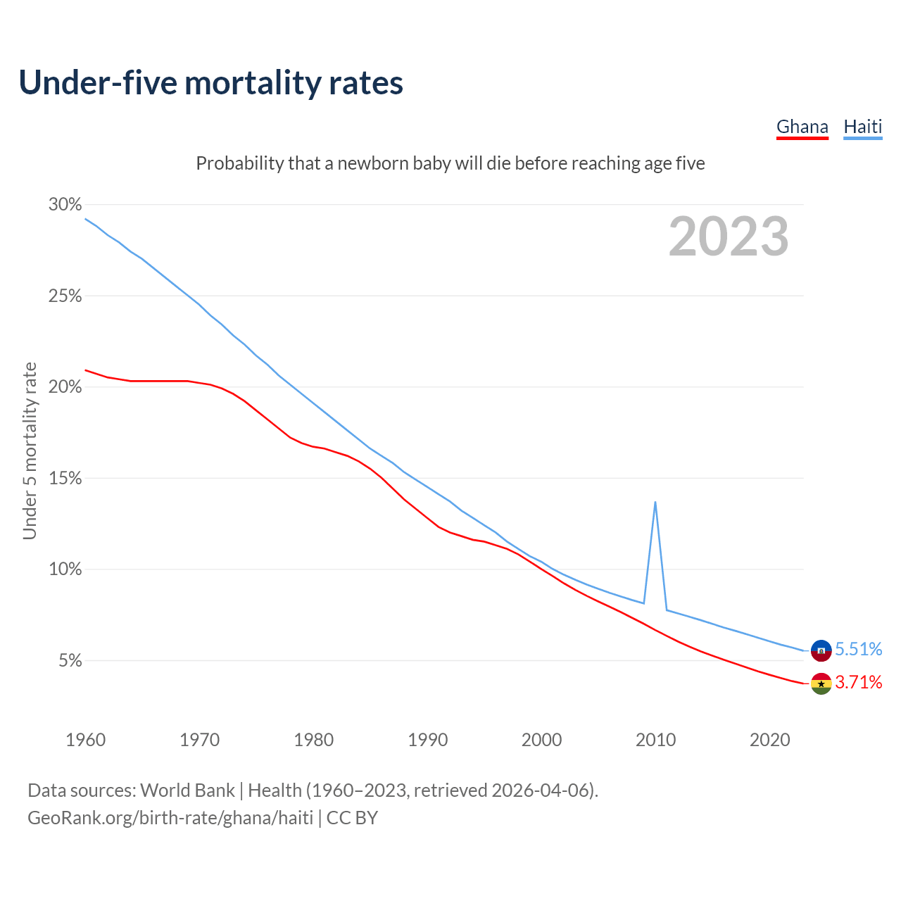 The chance that a newborn baby will die before reaching age five is 3.71% in Ghana and 5.51% in Haiti. Above is a chart with historical data on under-five mortality rates.