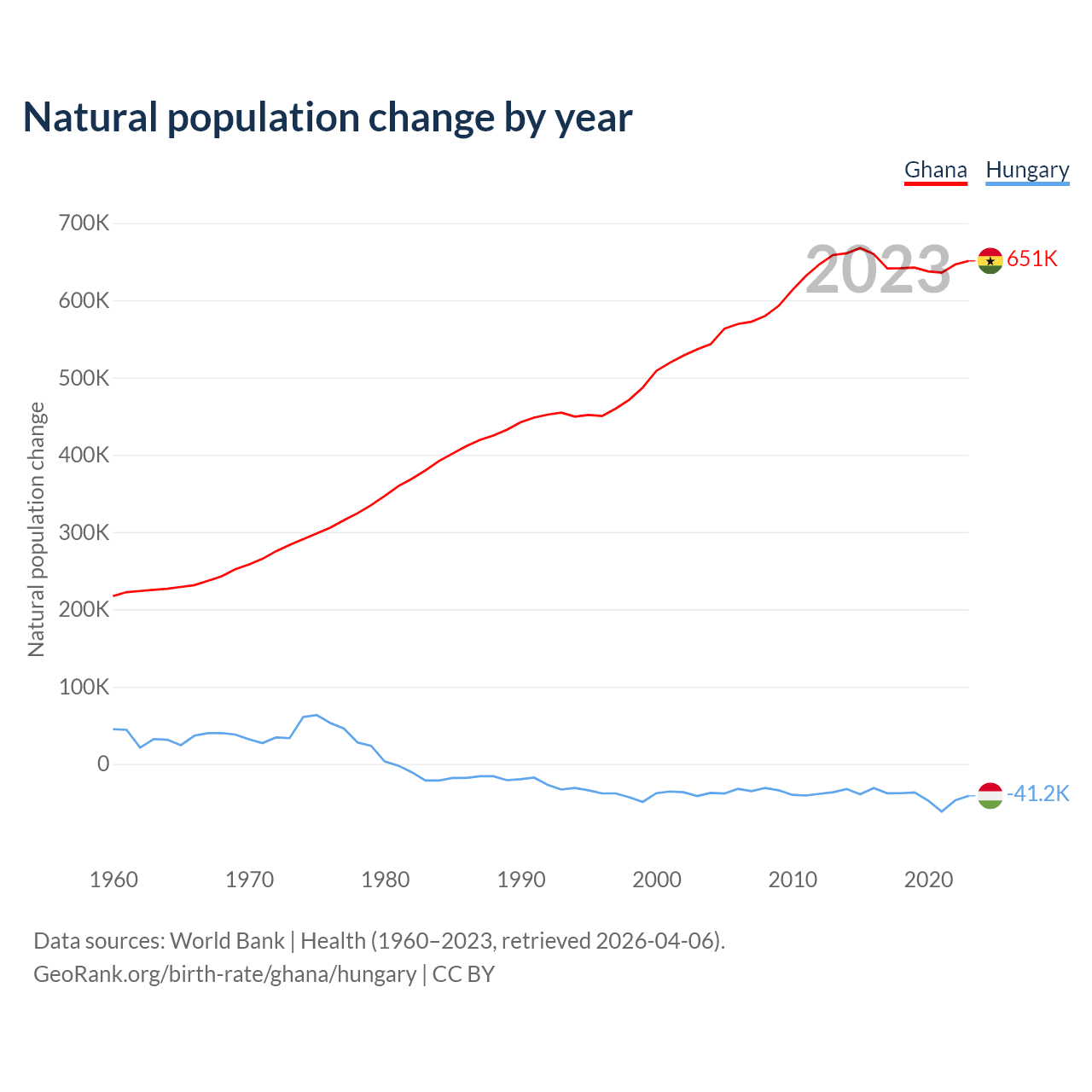 Ghana has an annual birth rate of 26.3 births per 1,000 people, compared to 9.1 for Hungary. The average number of children a woman is expected to have during her lifetime — the fertility rate, is 3.4 in Ghana and 1.51 in Hungary — 55.5% difference.