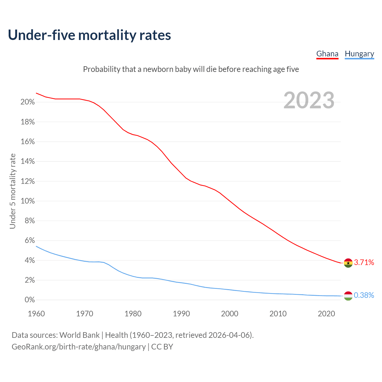 The chance that a newborn baby will die before reaching age five is 3.71% in Ghana and 0.38% in Hungary. Above is a chart with historical data on under-five mortality rates.