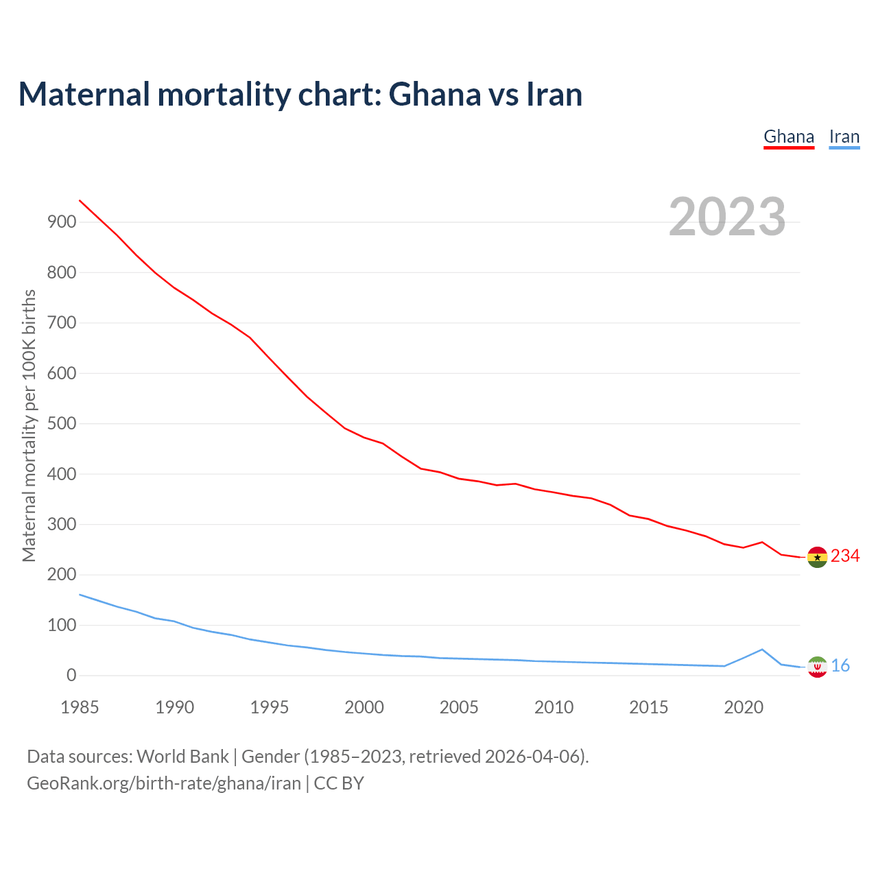 The maternal mortality rate, which is the probability of dying during childbirth or within 42 days of pregnancy termination, is 234 deaths per 100,000 live births in Ghana, compared to 16 deaths in Iran.