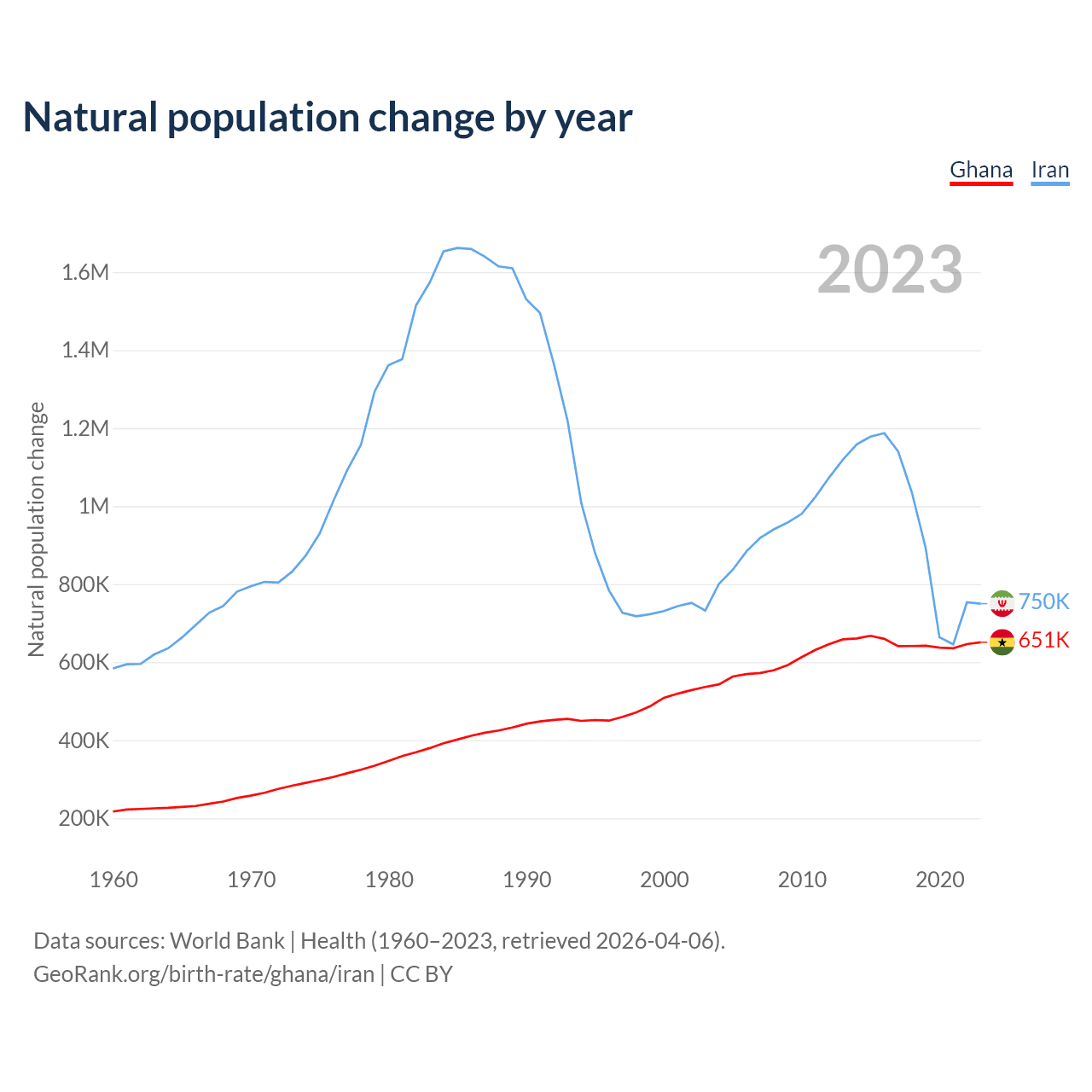 According to the latest available data on birth rates, the fertility rate in Ghana was 3.4 children per woman in 2023, compared to 1.7 in Iran in 2023. The replacement level is considered to be 2.1 children per woman.