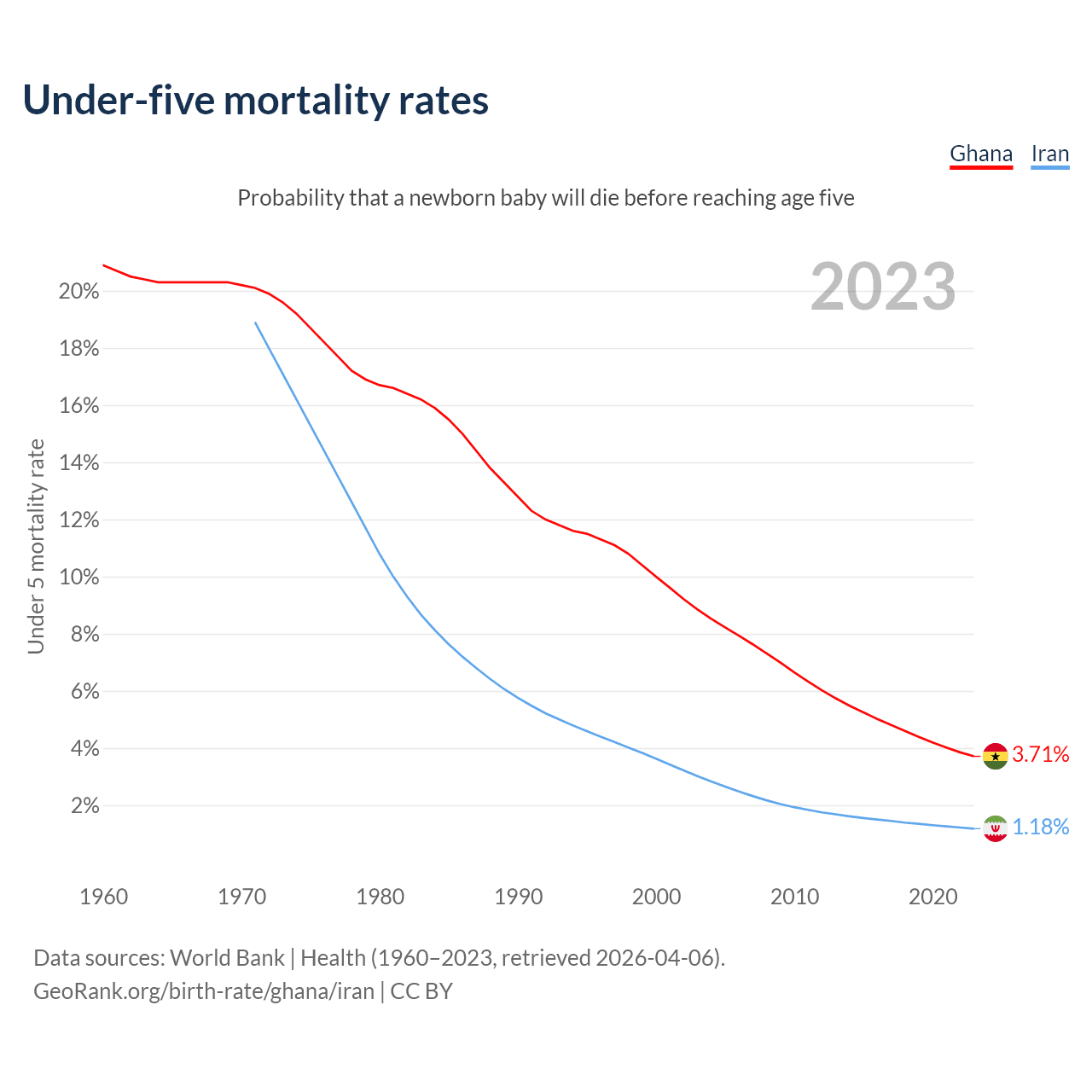 The chance that a newborn baby will die before reaching age five is 3.71% in Ghana and 1.18% in Iran. Above is a chart with historical data on under-five mortality rates.
