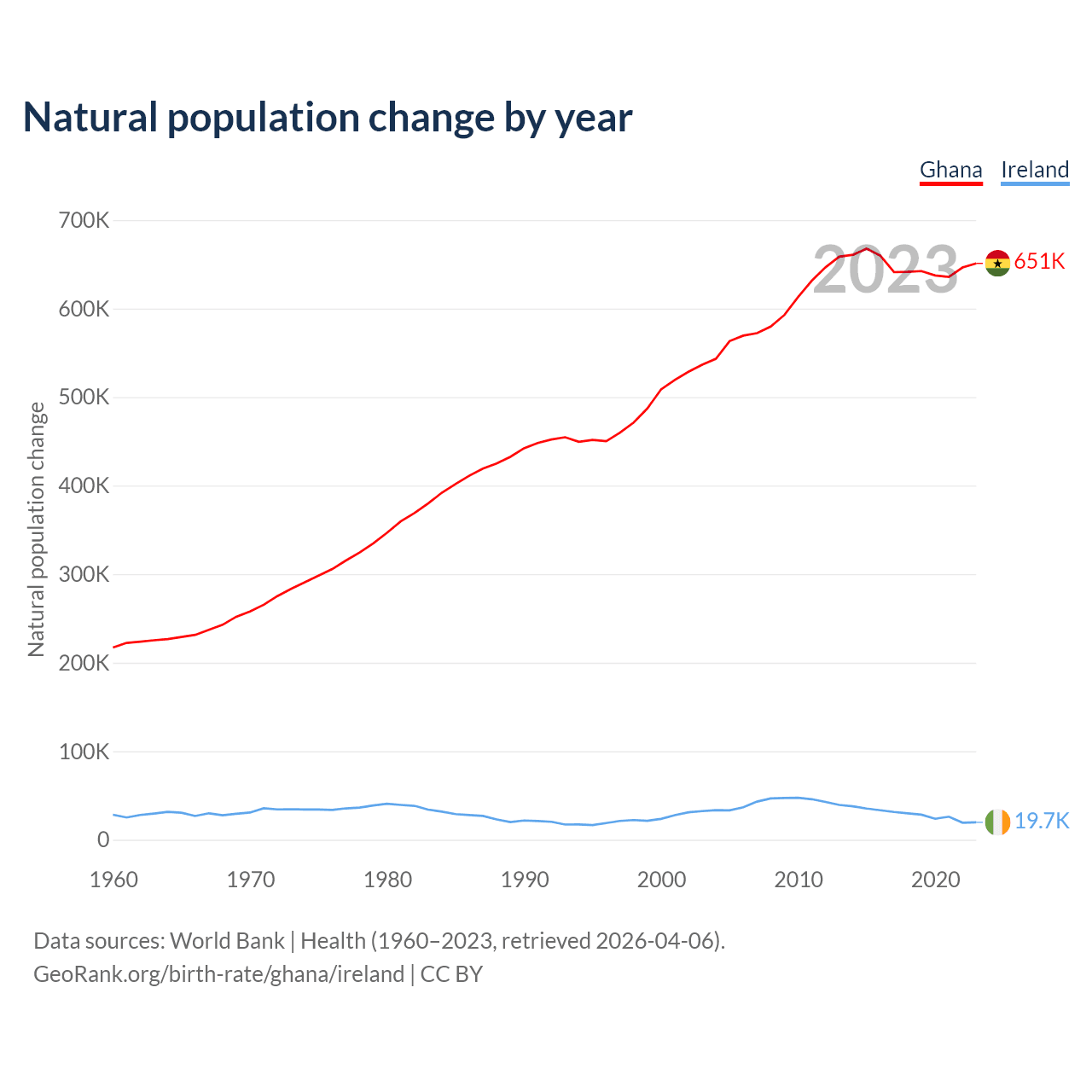 Ghana has an annual birth rate of 26.3 births per 1,000 people, compared to 10.3 for Ireland. The average number of children a woman is expected to have during her lifetime — the fertility rate, is 3.4 in Ghana and 1.5 in Ireland — 55.8% difference.