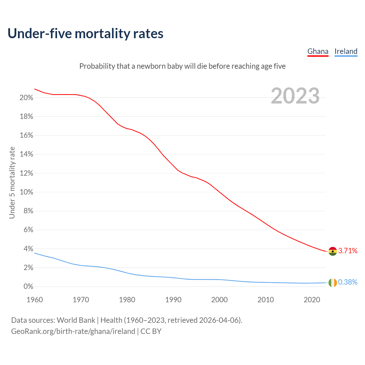 The chance that a newborn baby will die before reaching age five is 3.71% in Ghana and 0.38% in Ireland. Above is a chart with historical data on under-five mortality rates.