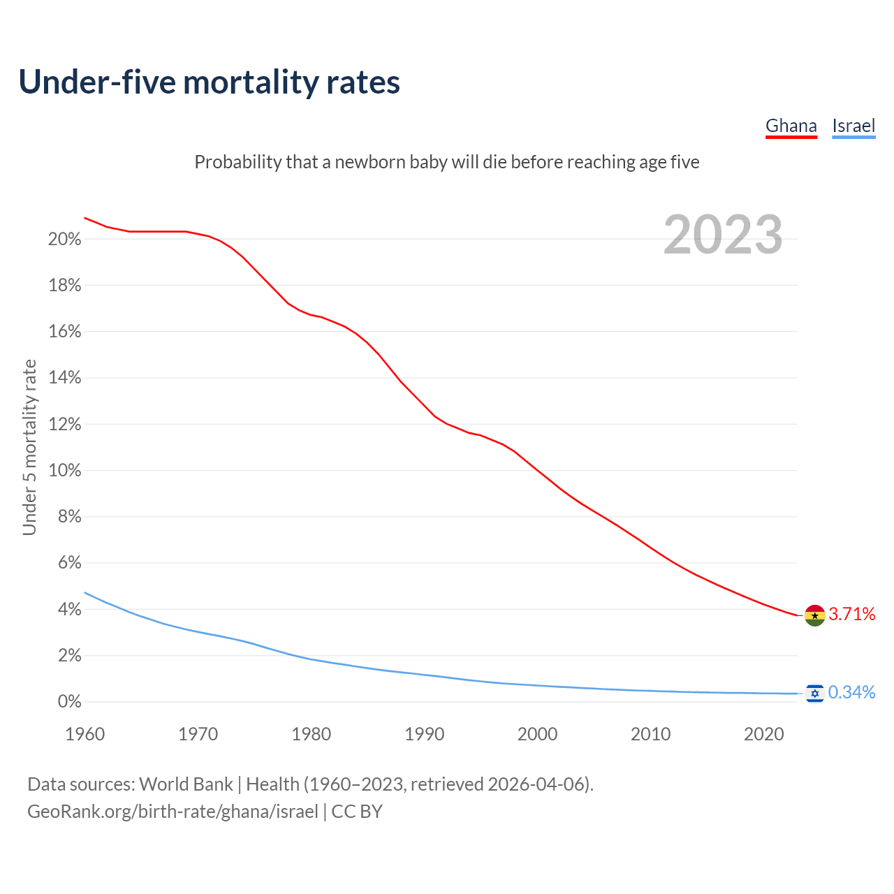 The chance that a newborn baby will die before reaching age five is 3.71% in Ghana and 0.34% in Israel. Above is a chart with historical data on under-five mortality rates.