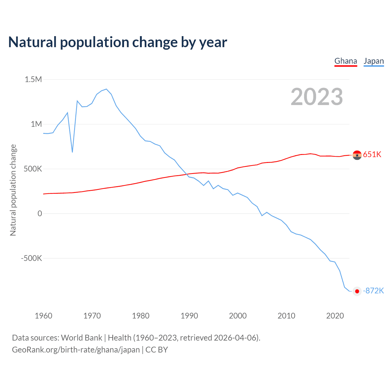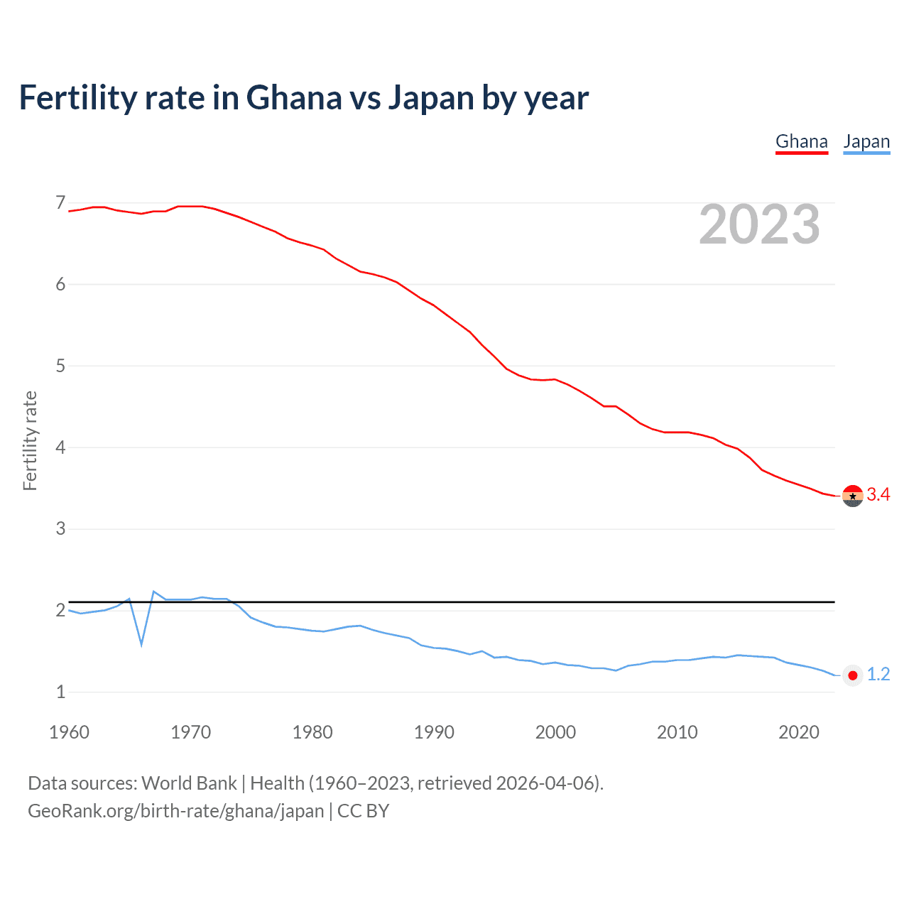 According to the latest available data on birth rates, the fertility rate in Ghana was 3.4 children per woman in 2023, compared to 1.2 in Japan in 2023. The replacement level is considered to be 2.1 children per woman.