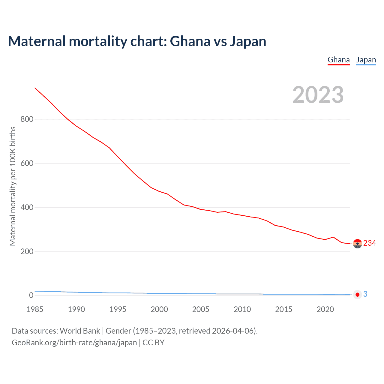The maternal mortality rate, which is the probability of dying during childbirth or within 42 days of pregnancy termination, is 234 deaths per 100,000 live births in Ghana, compared to 3 deaths in Japan.