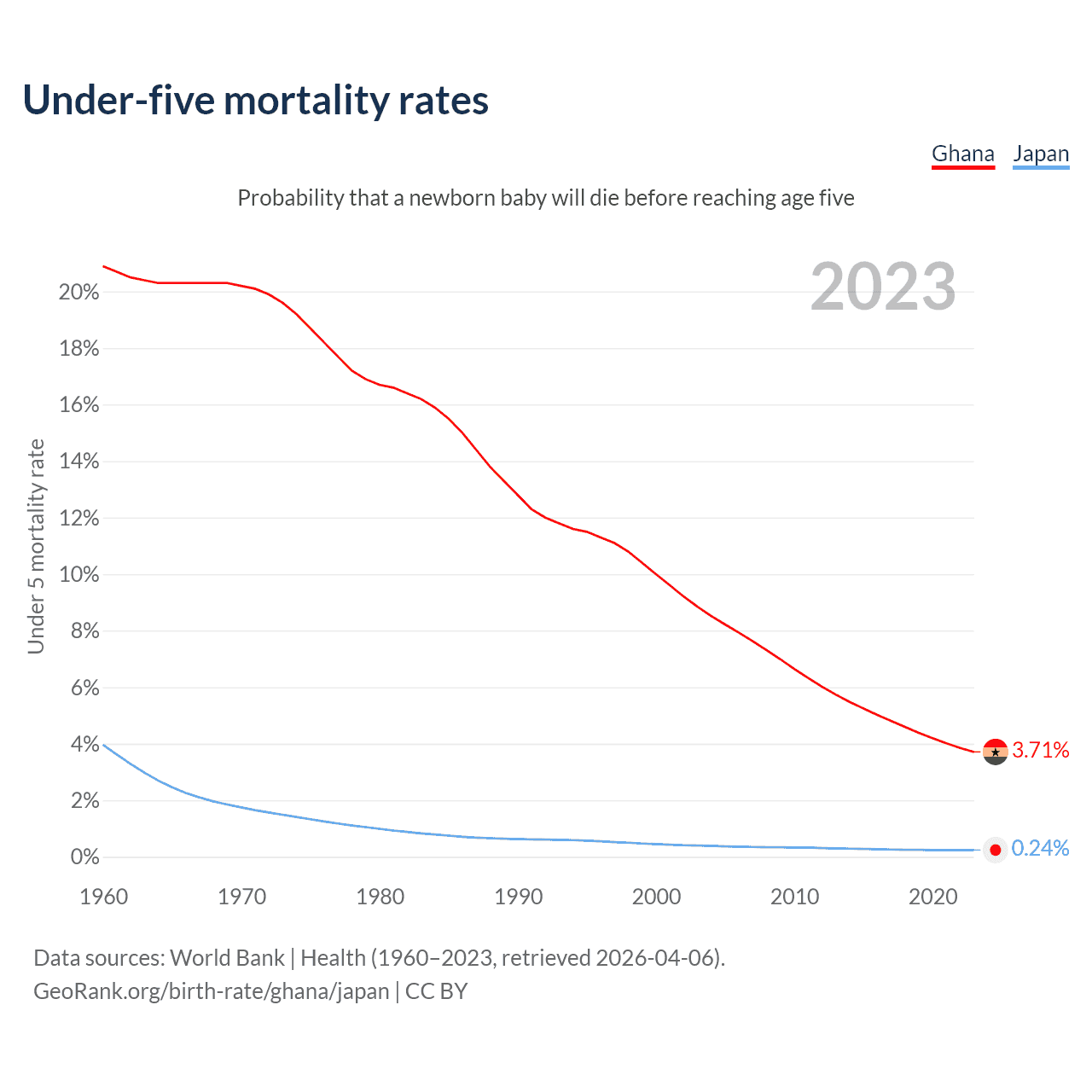 The chance that a newborn baby will die before reaching age five is 3.71% in Ghana and 0.24% in Japan. Above is a chart with historical data on under-five mortality rates.