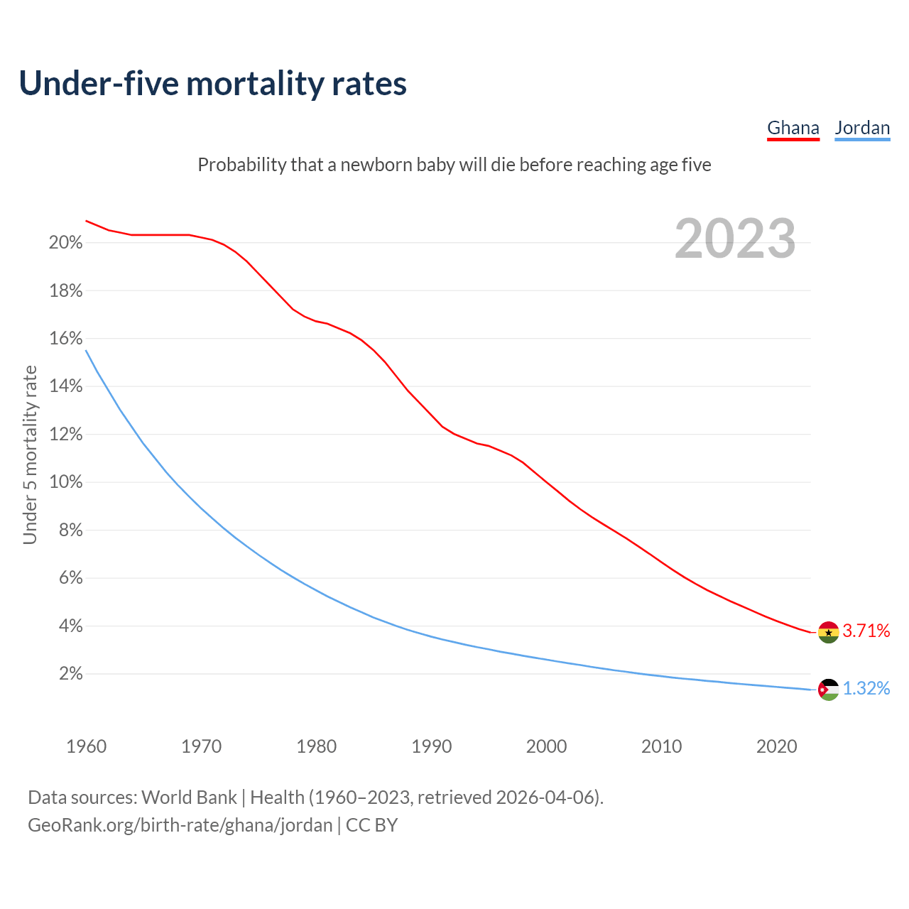 The chance that a newborn baby will die before reaching age five is 3.71% in Ghana and 1.32% in Jordan. Above is a chart with historical data on under-five mortality rates.