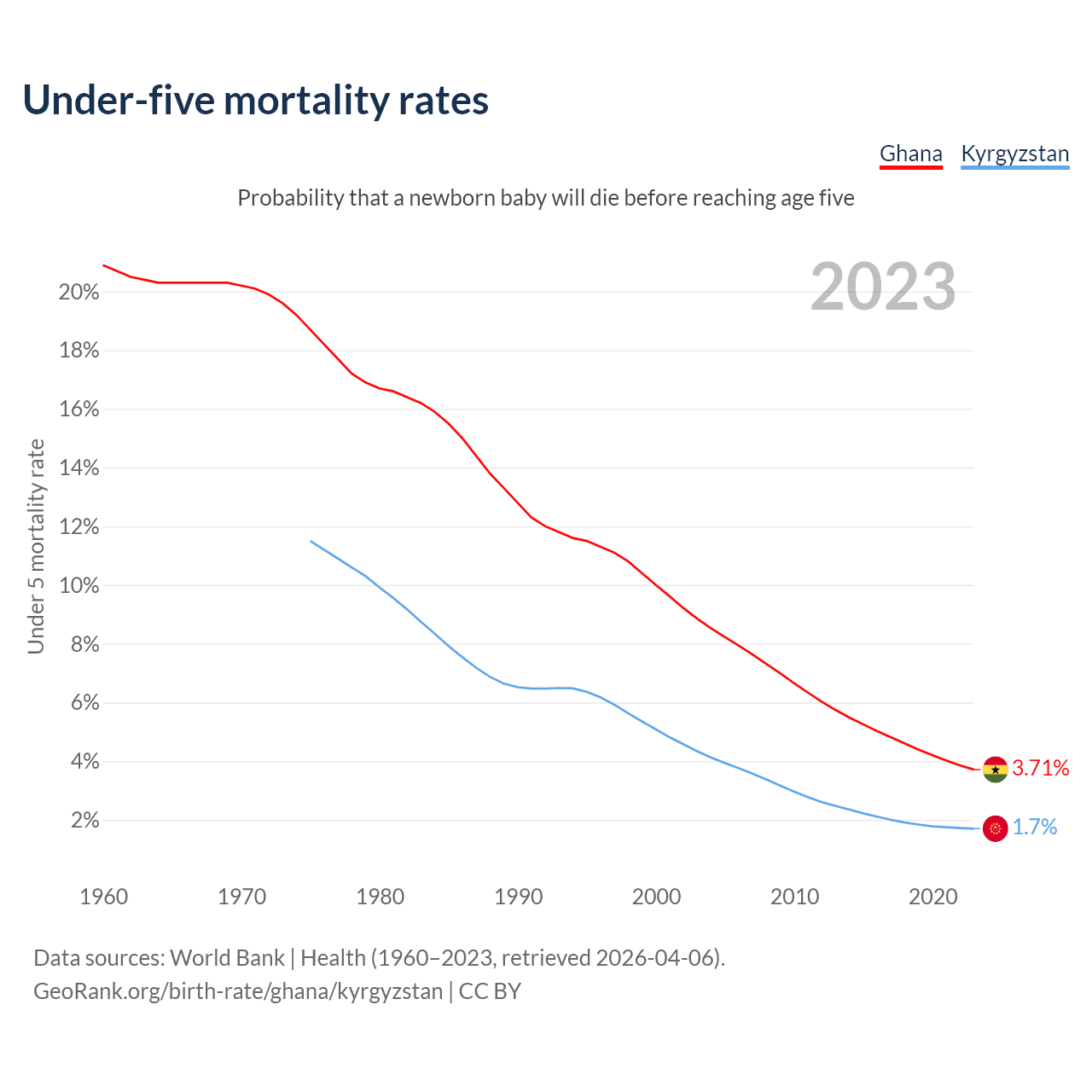 The chance that a newborn baby will die before reaching age five is 3.71% in Ghana and 1.7% in Kyrgyzstan. Above is a chart with historical data on under-five mortality rates.