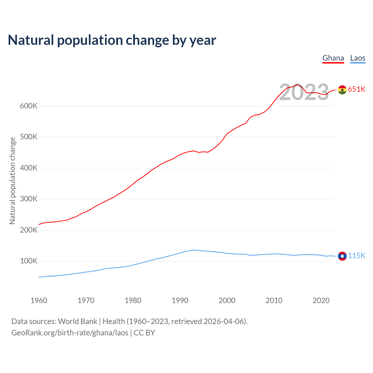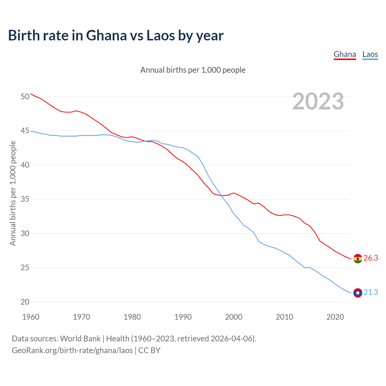 Ghana has an annual birth rate of 26.3 births per 1,000 people, compared to 21.3 for Laos. The average number of children a woman is expected to have during her lifetime — the fertility rate, is 3.4 in Ghana and 2.42 in Laos — 28.7% difference.