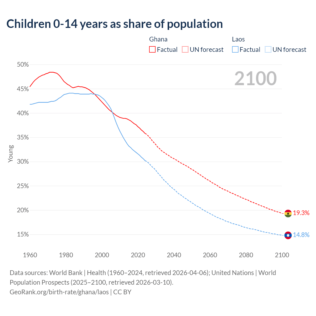 According to the latest available data on birth rates, the fertility rate in Ghana was 3.4 children per woman in 2023, compared to 2.42 in Laos in 2023. The replacement level is considered to be 2.1 children per woman.