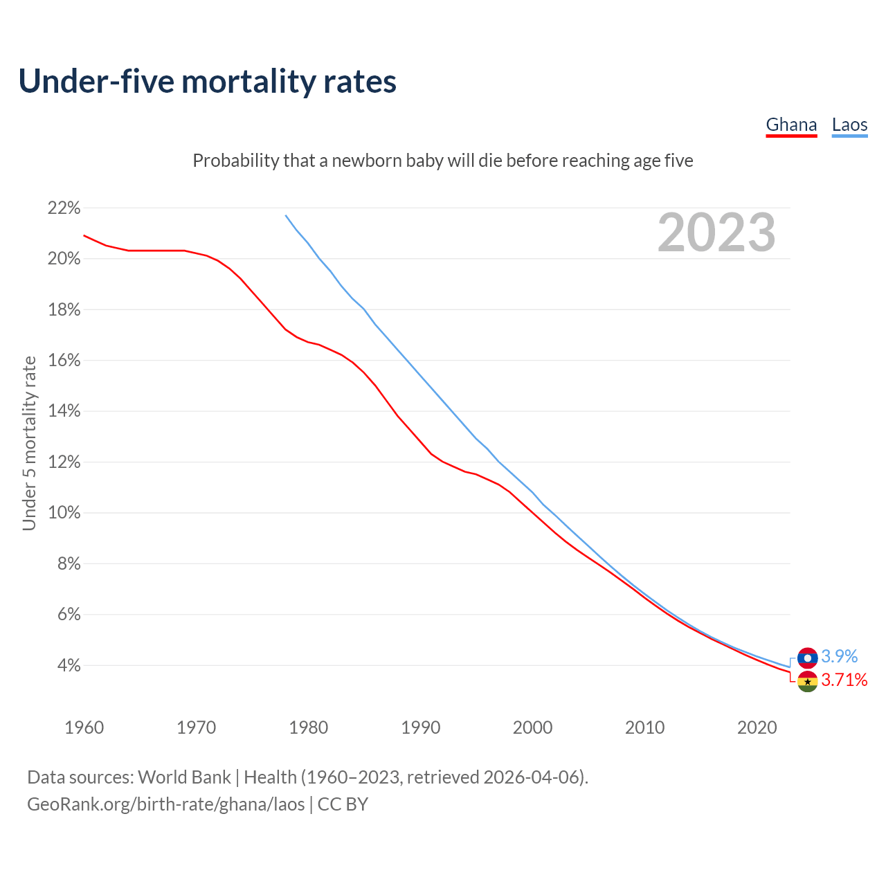 The chance that a newborn baby will die before reaching age five is 3.71% in Ghana and 3.9% in Laos. Above is a chart with historical data on under-five mortality rates.
