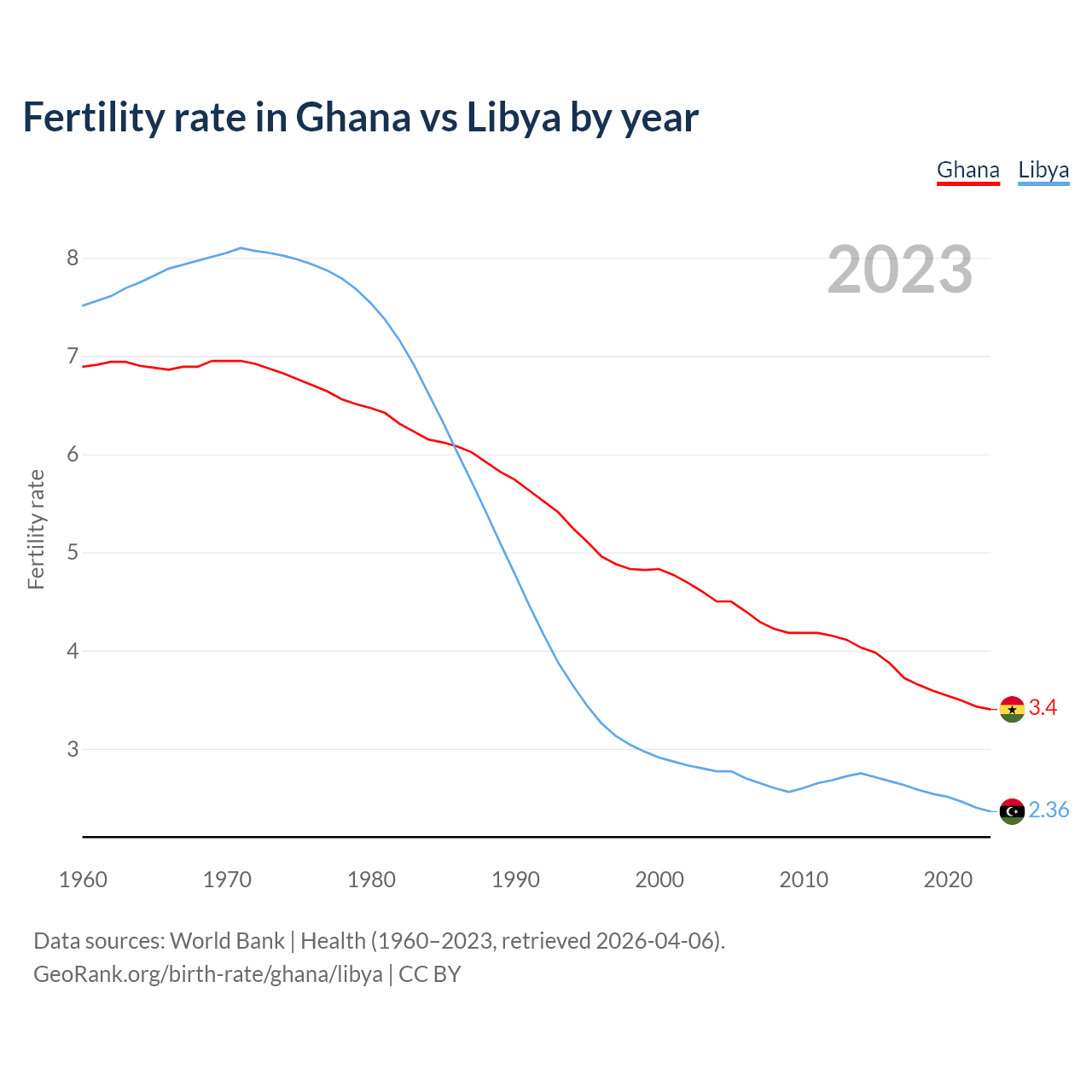 1960 vs 2023, the fertility rate has decreased by 50.7% in Ghana and by 68.6% in Libya — in 1960, it was 6.89 and 7.51, respectively.