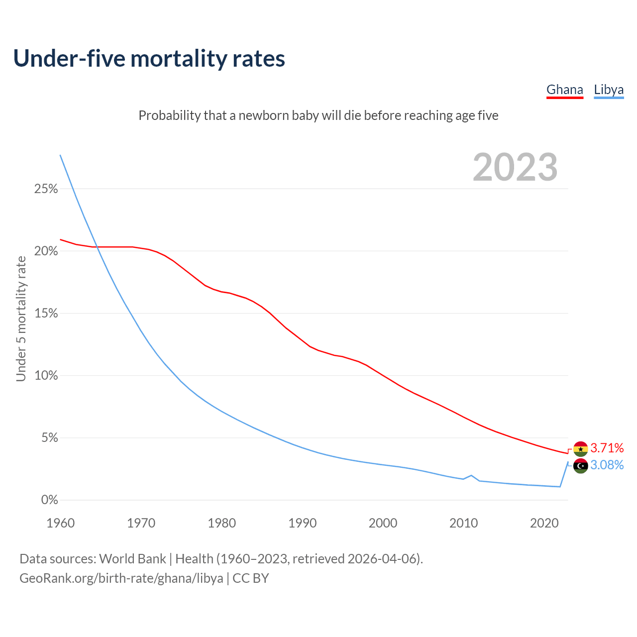 The chance that a newborn baby will die before reaching age five is 3.71% in Ghana and 3.08% in Libya. Above is a chart with historical data on under-five mortality rates.