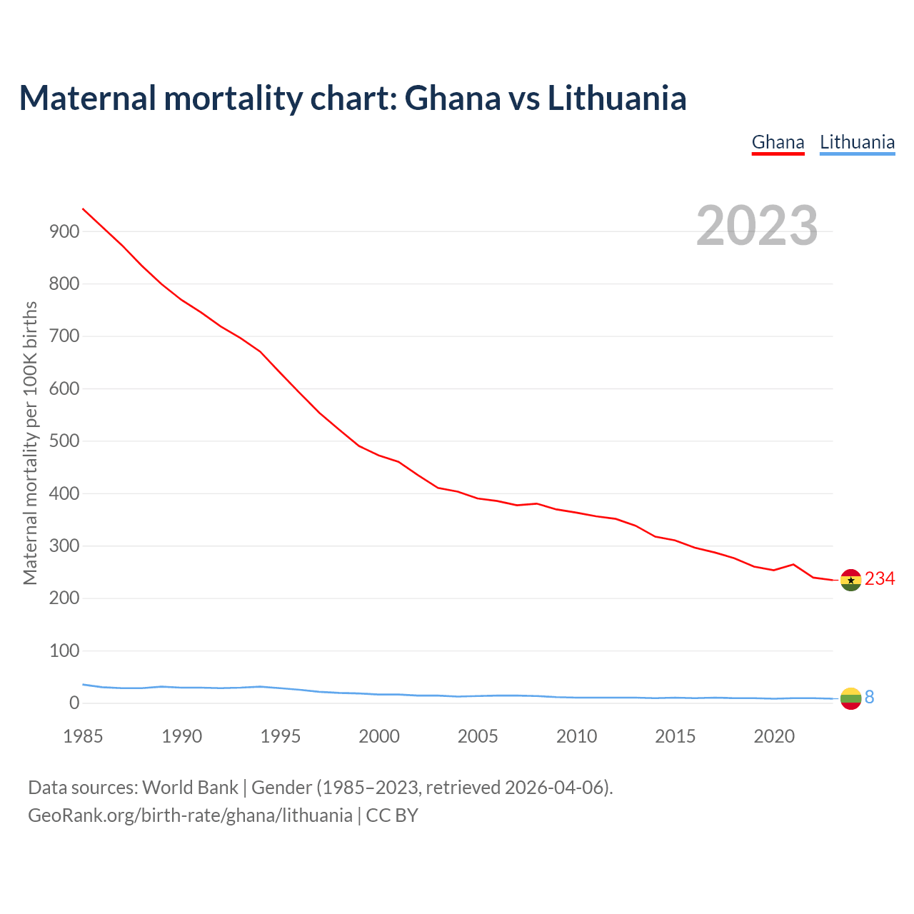 The maternal mortality rate, which is the probability of dying during childbirth or within 42 days of pregnancy termination, is 234 deaths per 100,000 live births in Ghana, compared to 8 deaths in Lithuania.