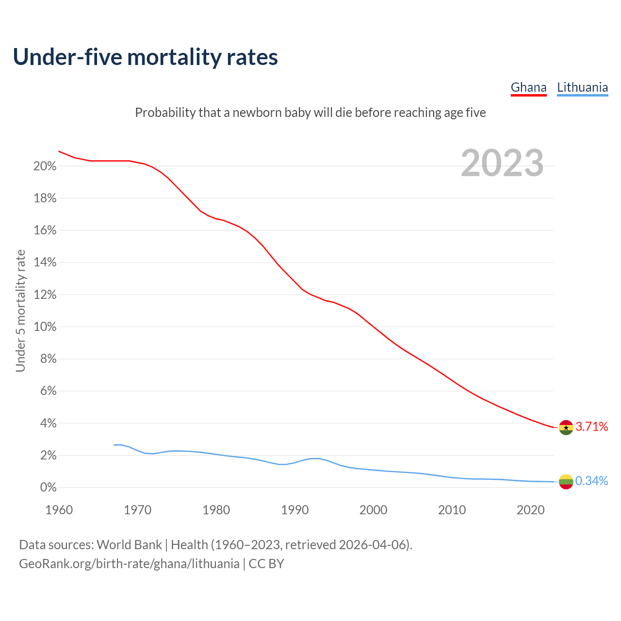 The chance that a newborn baby will die before reaching age five is 3.71% in Ghana and 0.34% in Lithuania. Above is a chart with historical data on under-five mortality rates.