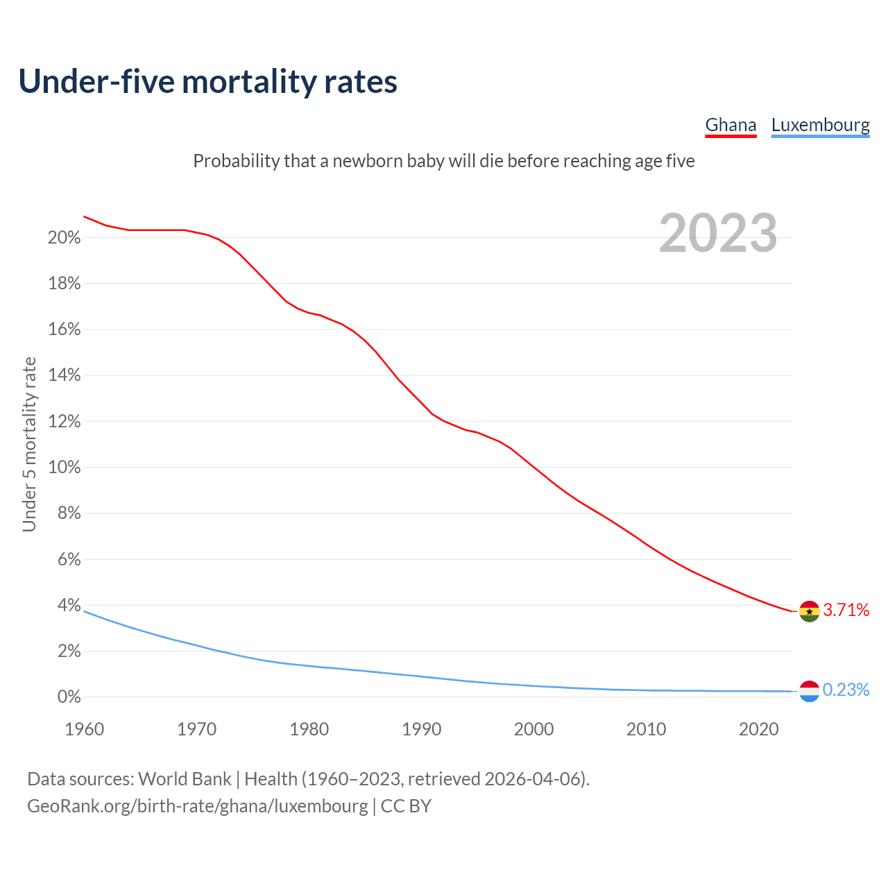 The chance that a newborn baby will die before reaching age five is 3.71% in Ghana and 0.23% in Luxembourg. Above is a chart with historical data on under-five mortality rates.