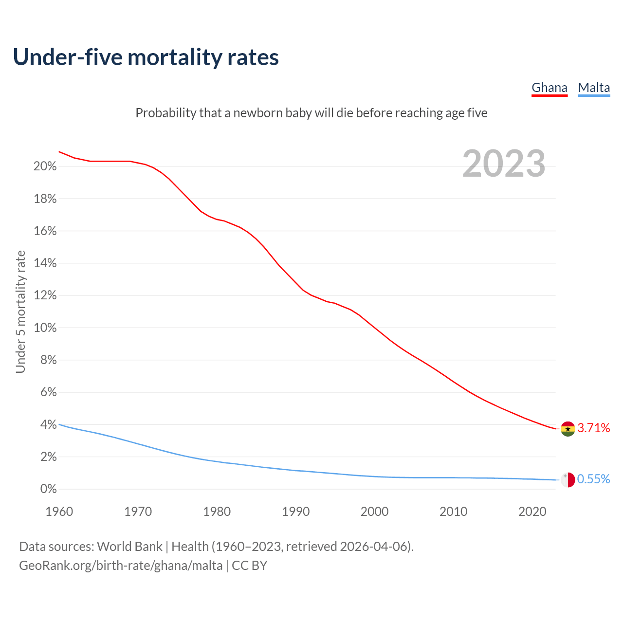The chance that a newborn baby will die before reaching age five is 3.71% in Ghana and 0.55% in Malta. Above is a chart with historical data on under-five mortality rates.
