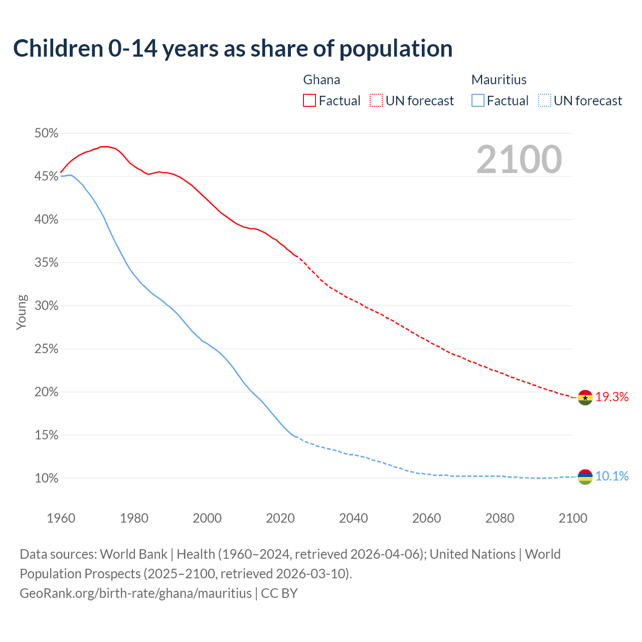 Ghana has an annual birth rate of 26.3 births per 1,000 people, compared to 10.2 for Mauritius. The average number of children a woman is expected to have during her lifetime — the fertility rate, is 3.4 in Ghana and 1.39 in Mauritius — 59.1% difference.