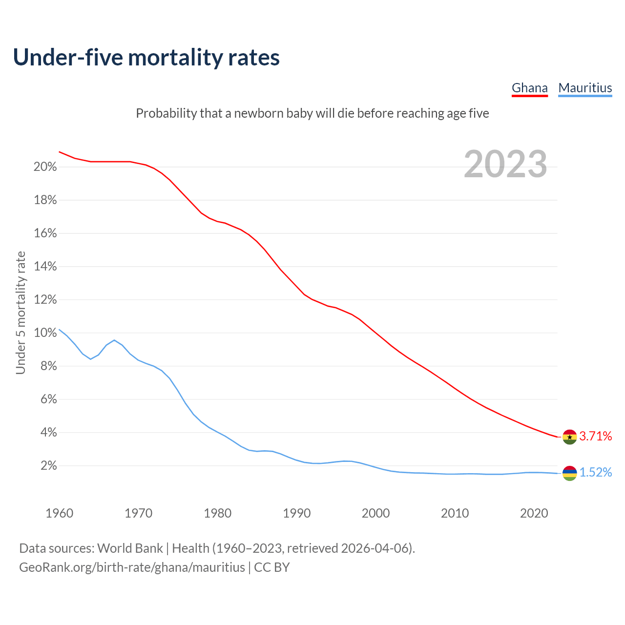 The chance that a newborn baby will die before reaching age five is 3.71% in Ghana and 1.52% in Mauritius. Above is a chart with historical data on under-five mortality rates.
