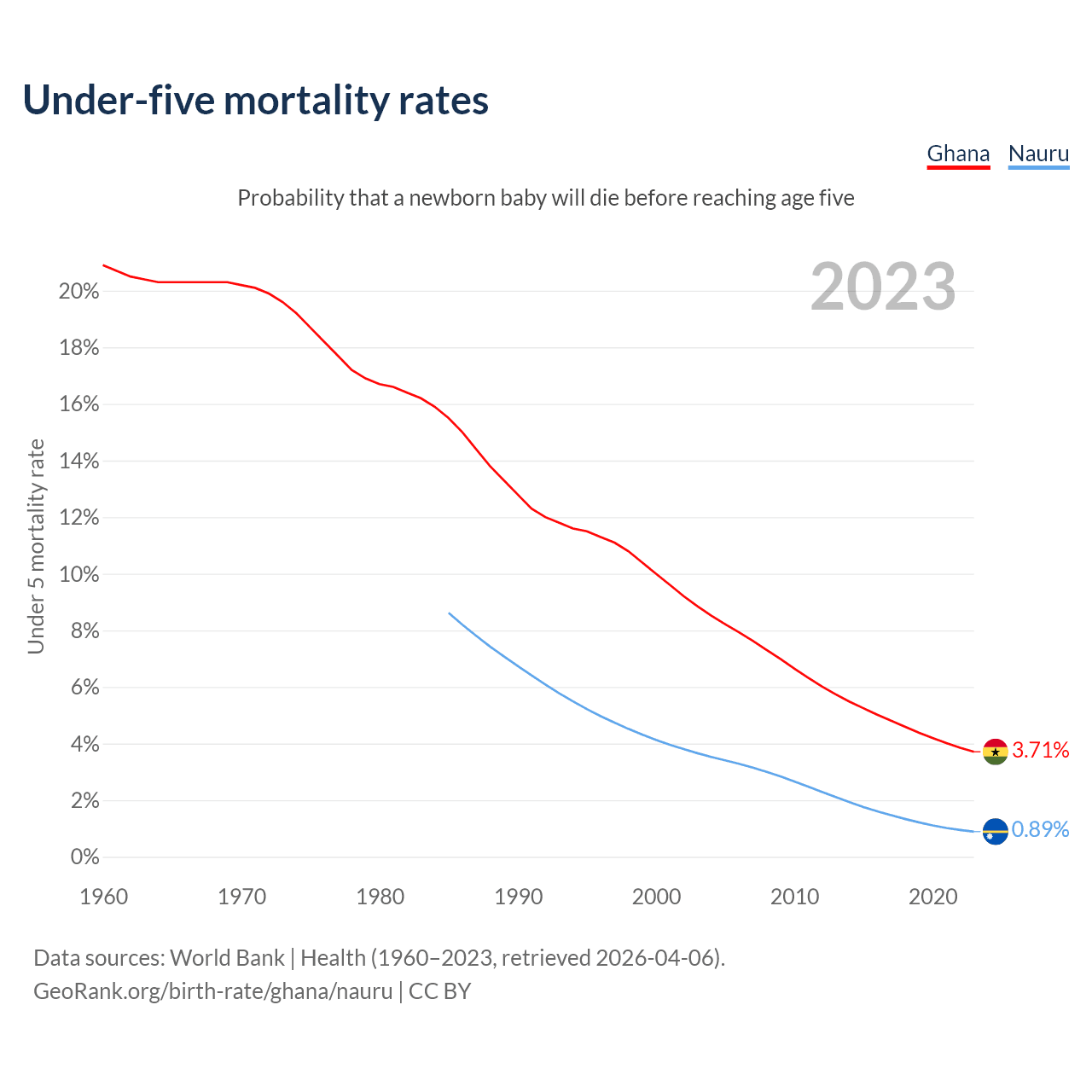 The chance that a newborn baby will die before reaching age five is 3.71% in Ghana and 0.89% in Nauru. Above is a chart with historical data on under-five mortality rates.