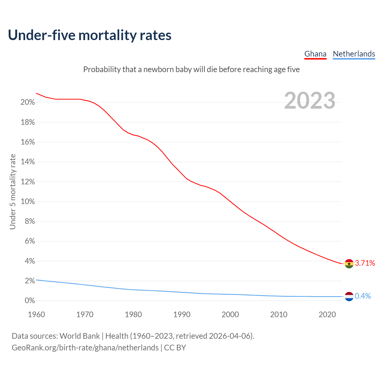 The chance that a newborn baby will die before reaching age five is 3.71% in Ghana and 0.4% in the Netherlands. Above is a chart with historical data on under-five mortality rates.