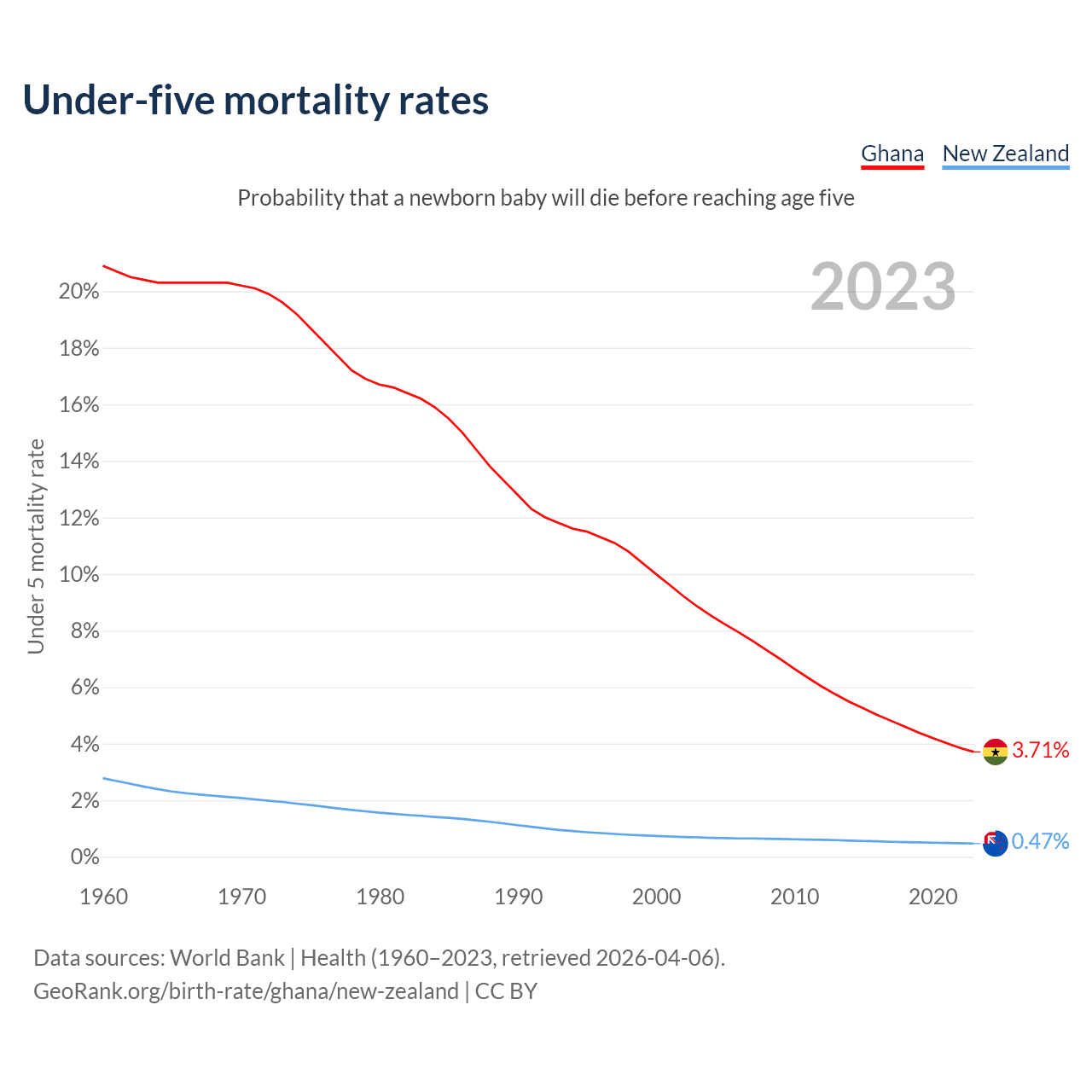 The chance that a newborn baby will die before reaching age five is 3.71% in Ghana and 0.47% in New Zealand. Above is a chart with historical data on under-five mortality rates.