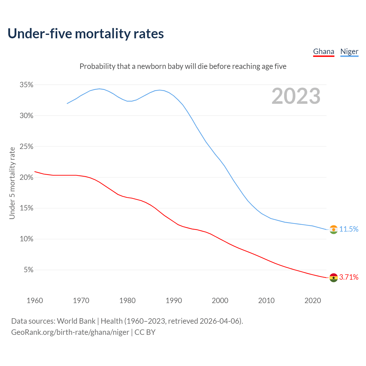 The chance that a newborn baby will die before reaching age five is 3.71% in Ghana and 11.5% in Niger. Above is a chart with historical data on under-five mortality rates.