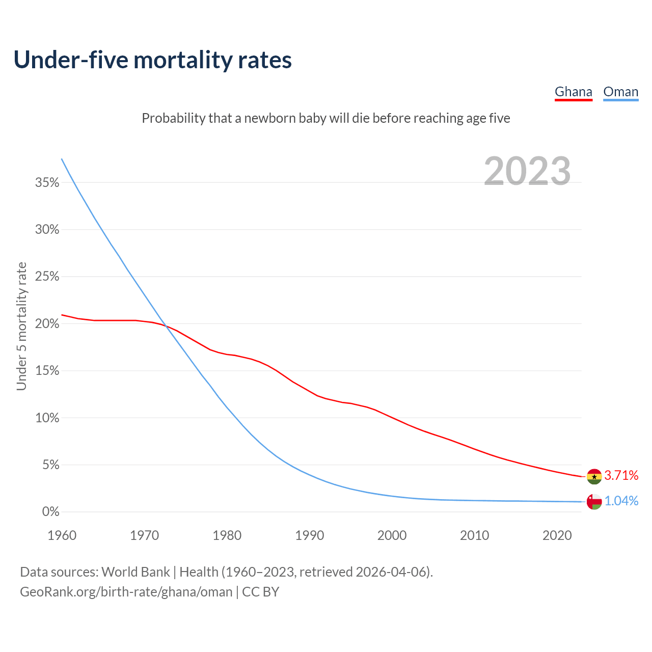 The chance that a newborn baby will die before reaching age five is 3.71% in Ghana and 1.04% in Oman. Above is a chart with historical data on under-five mortality rates.