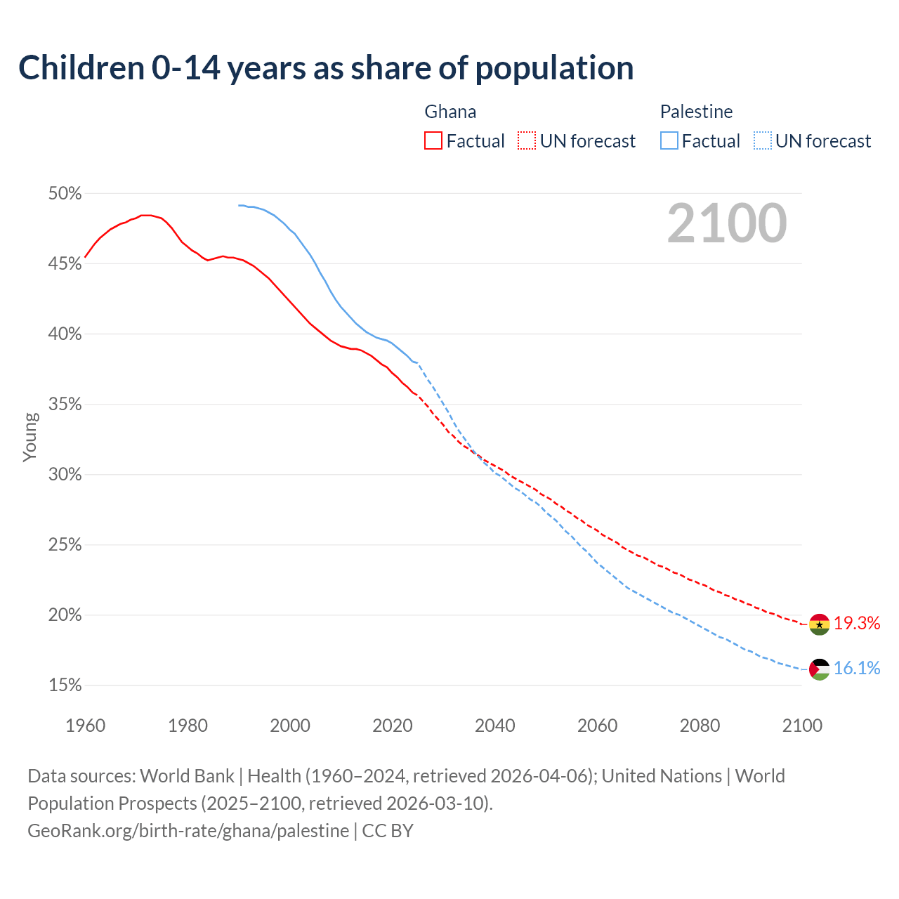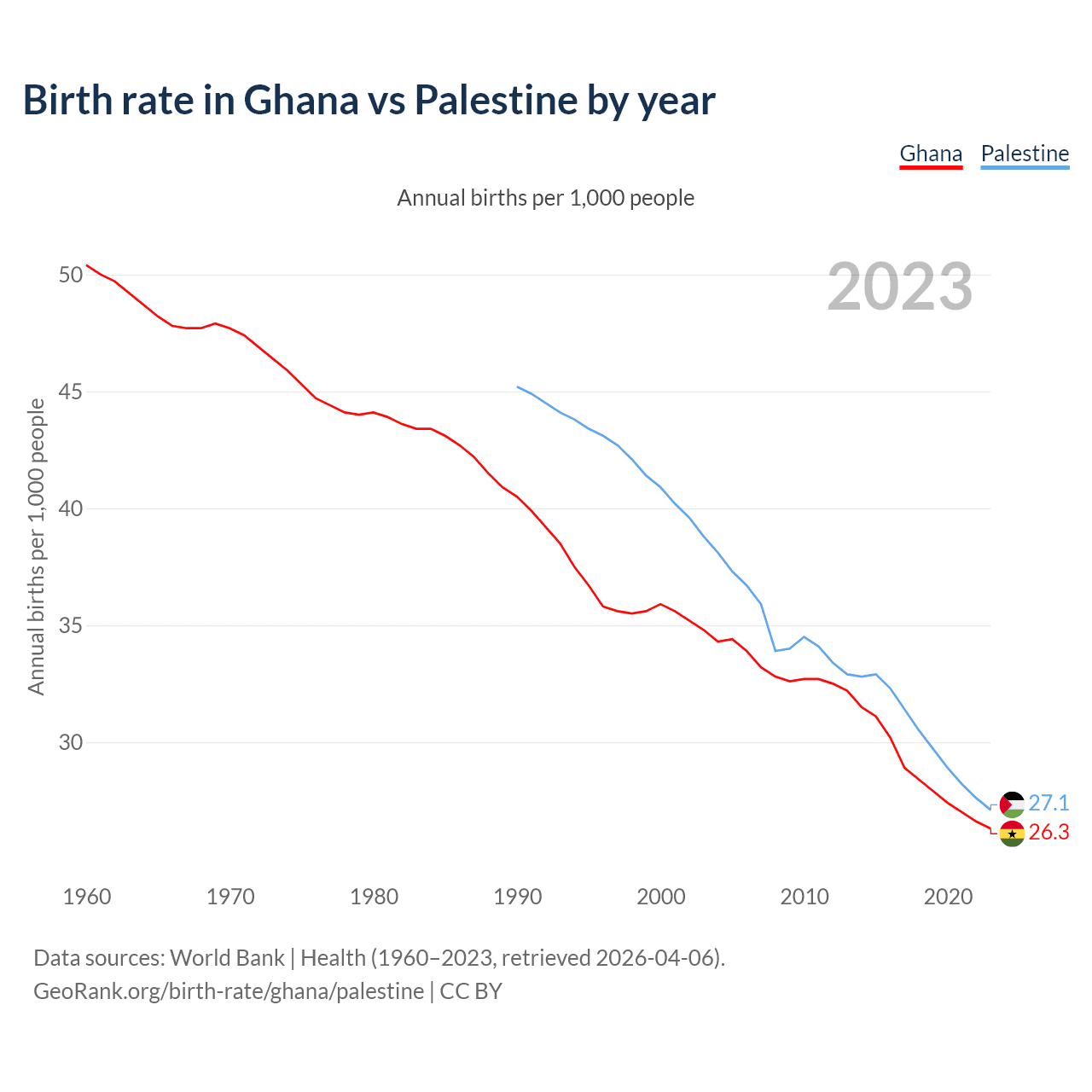 Ghana has an annual birth rate of 26.3 births per 1,000 people, compared to 27.1 for Palestine. The average number of children a woman is expected to have during her lifetime — the fertility rate, is 3.4 in Ghana and 3.31 in Palestine — 2.53% difference.