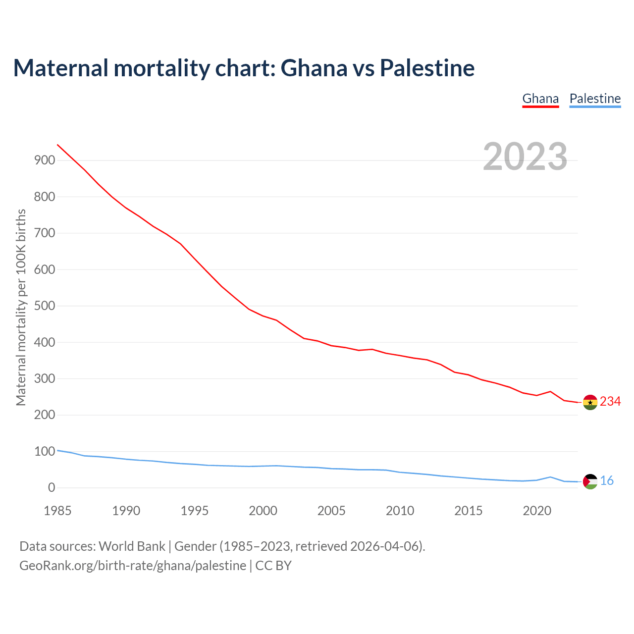 The maternal mortality rate, which is the probability of dying during childbirth or within 42 days of pregnancy termination, is 234 deaths per 100,000 live births in Ghana, compared to 16 deaths in Palestine.