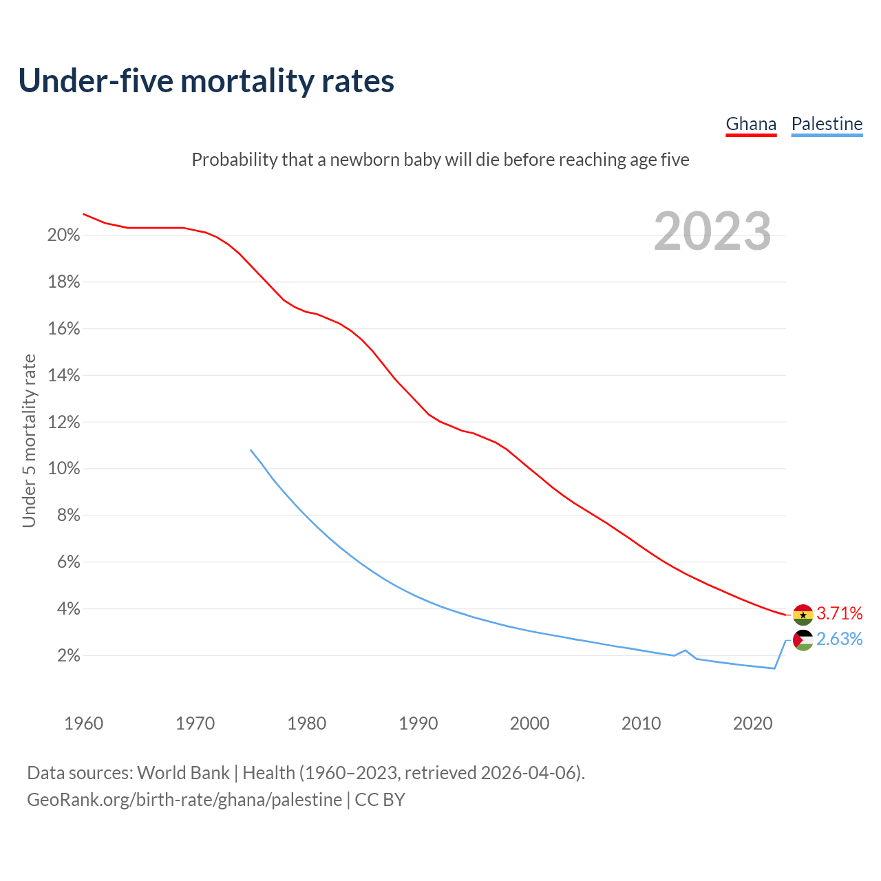The chance that a newborn baby will die before reaching age five is 3.71% in Ghana and 2.63% in Palestine. Above is a chart with historical data on under-five mortality rates.