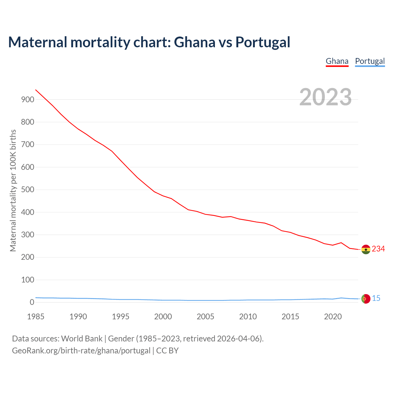 The maternal mortality rate, which is the probability of dying during childbirth or within 42 days of pregnancy termination, is 234 deaths per 100,000 live births in Ghana, compared to 15 deaths in Portugal.