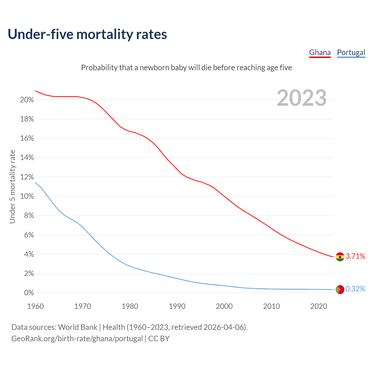 The chance that a newborn baby will die before reaching age five is 3.71% in Ghana and 0.32% in Portugal. Above is a chart with historical data on under-five mortality rates.
