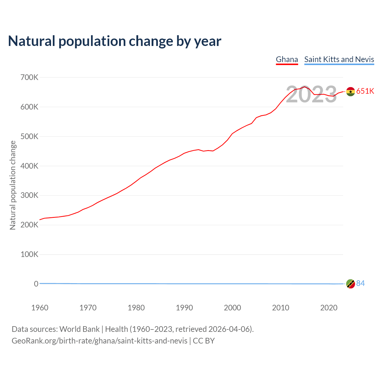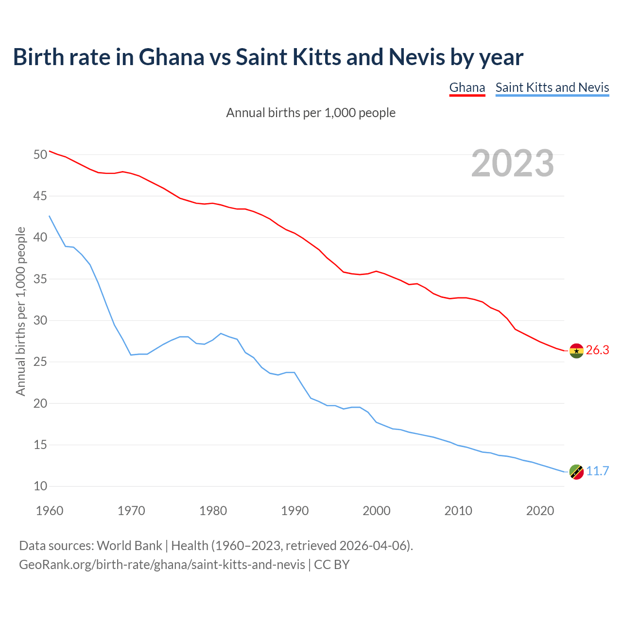 Ghana has an annual birth rate of 26.3 births per 1,000 people, compared to 11.7 for Saint Kitts and Nevis. The average number of children a woman is expected to have during her lifetime — the fertility rate, is 3.4 in Ghana and 1.51 in Saint Kitts and Nevis — 55.7% difference.