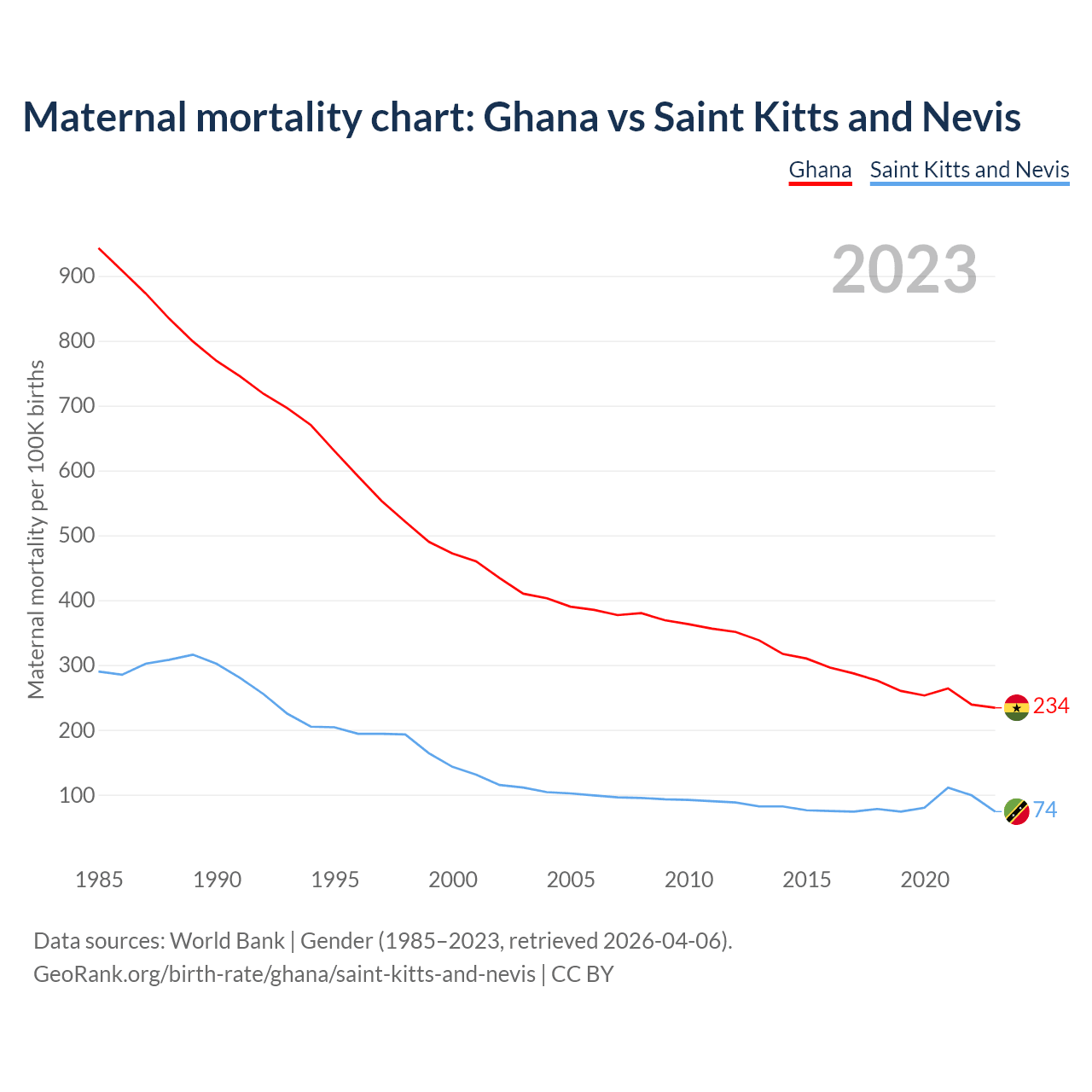 The maternal mortality rate, which is the probability of dying during childbirth or within 42 days of pregnancy termination, is 234 deaths per 100,000 live births in Ghana, compared to 74 deaths in Saint Kitts and Nevis.