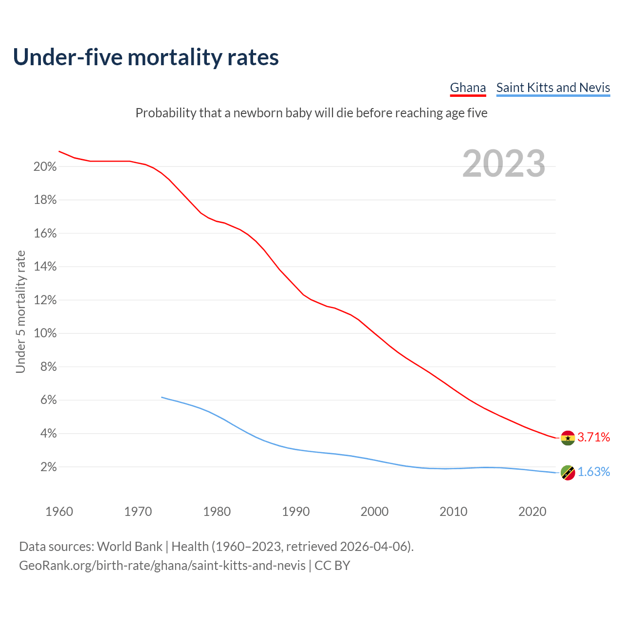 The chance that a newborn baby will die before reaching age five is 3.71% in Ghana and 1.63% in Saint Kitts and Nevis. Above is a chart with historical data on under-five mortality rates.