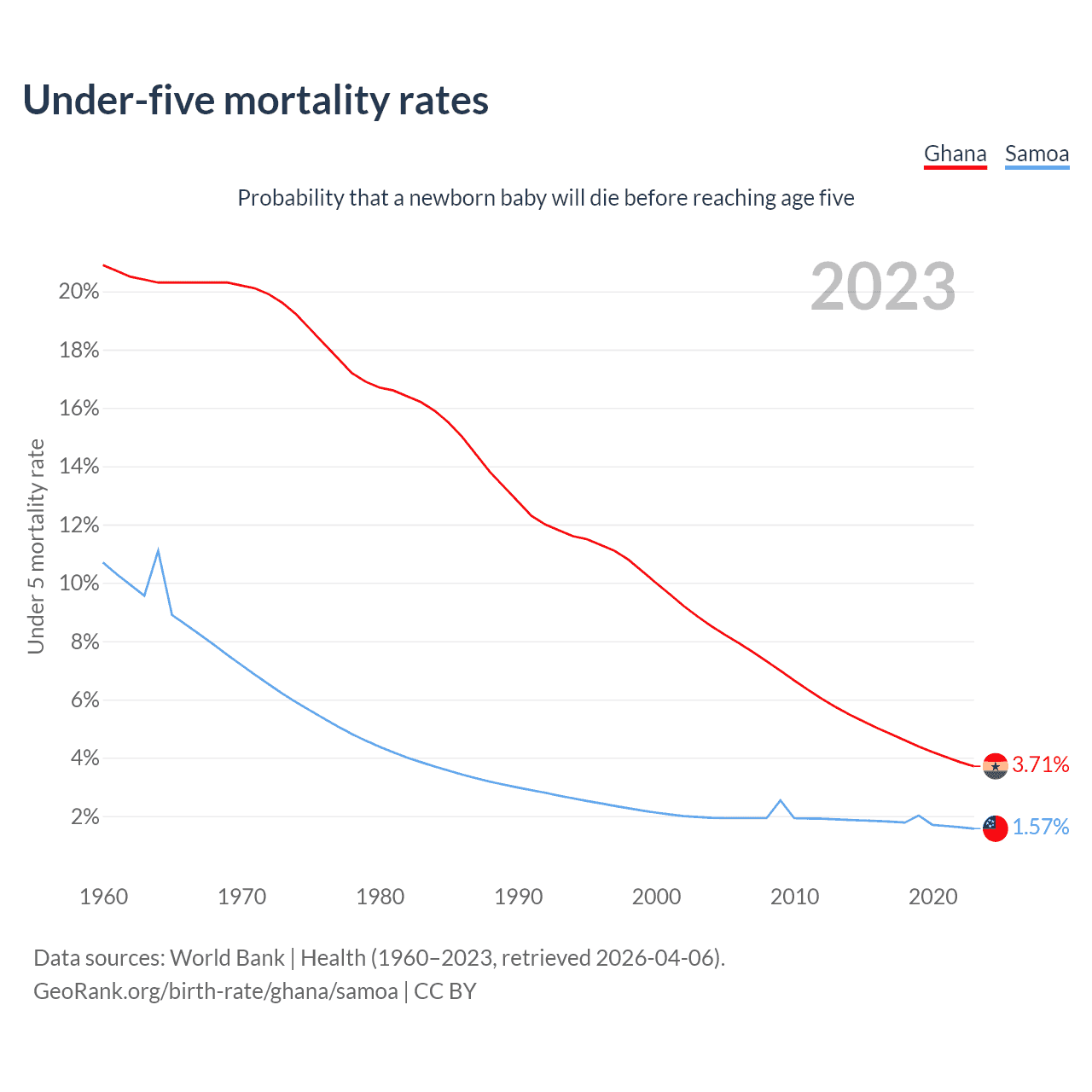 The chance that a newborn baby will die before reaching age five is 3.71% in Ghana and 1.57% in Samoa. Above is a chart with historical data on under-five mortality rates.