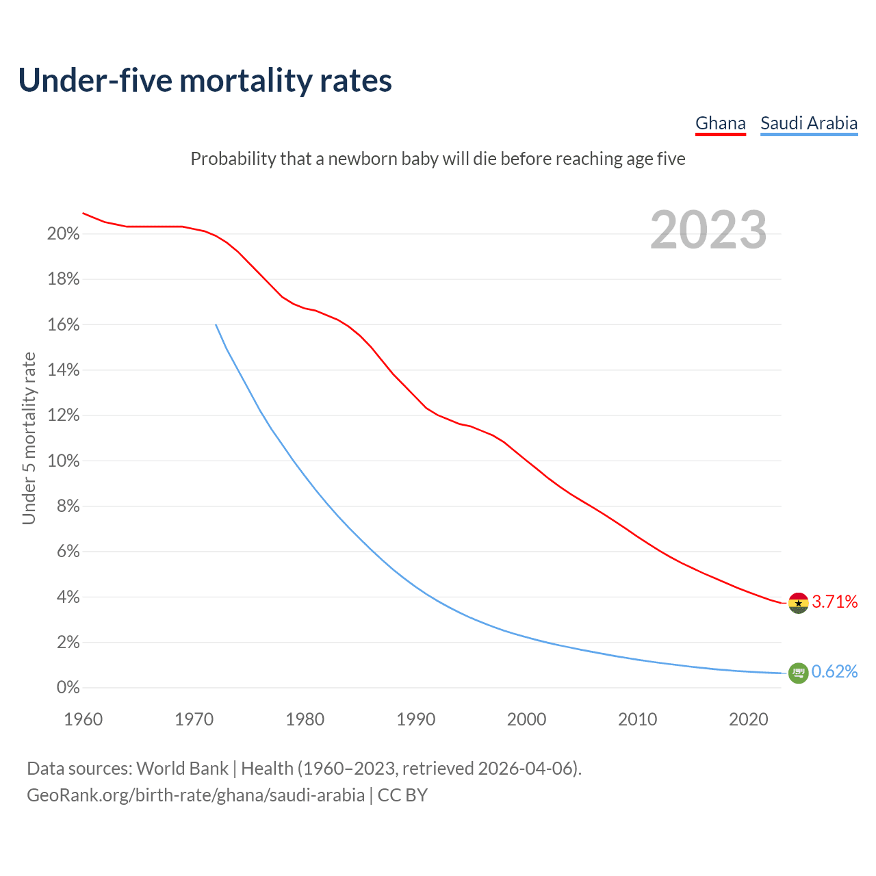 The chance that a newborn baby will die before reaching age five is 3.71% in Ghana and 0.62% in Saudi Arabia. Above is a chart with historical data on under-five mortality rates.