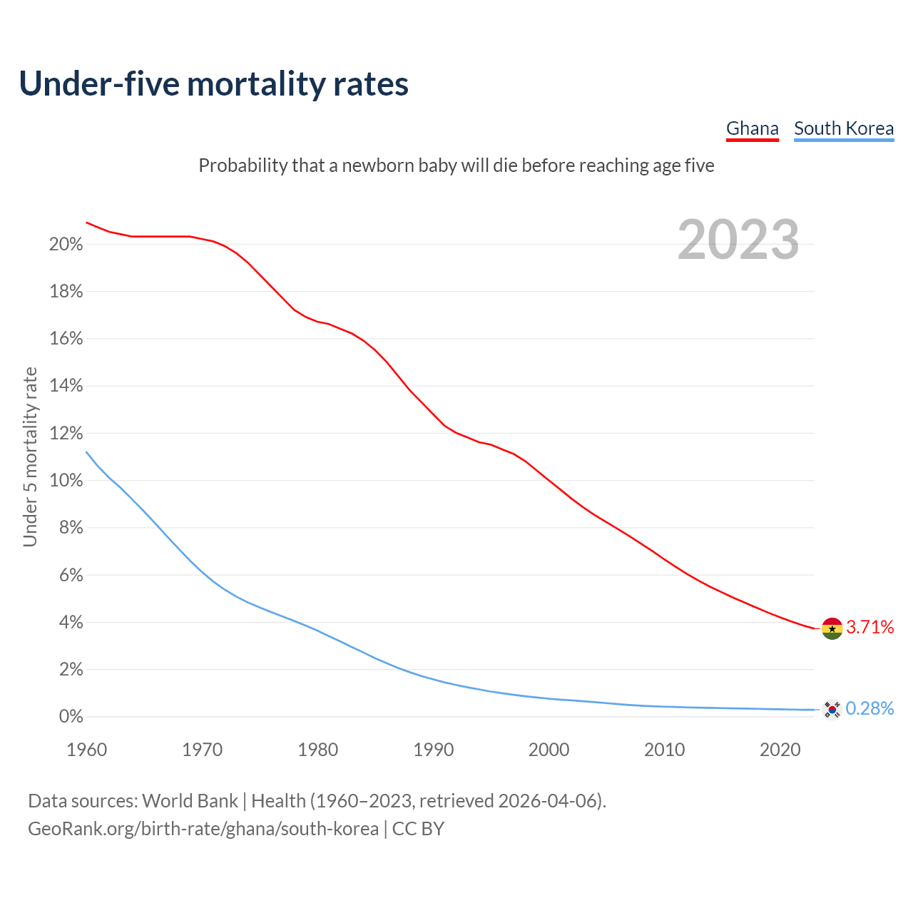 The chance that a newborn baby will die before reaching age five is 3.71% in Ghana and 0.28% in South Korea. Above is a chart with historical data on under-five mortality rates.