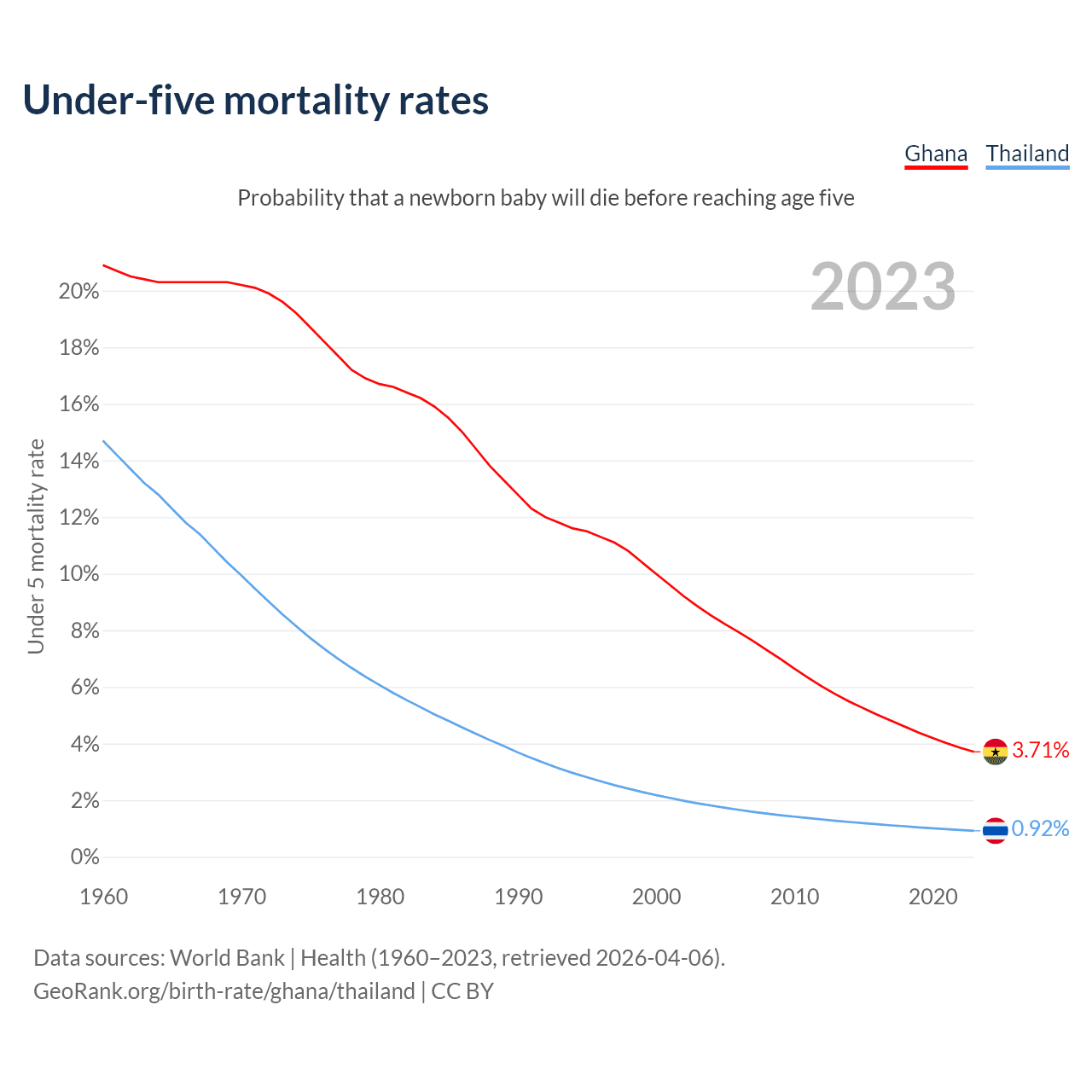 The chance that a newborn baby will die before reaching age five is 3.71% in Ghana and 0.92% in Thailand. Above is a chart with historical data on under-five mortality rates.