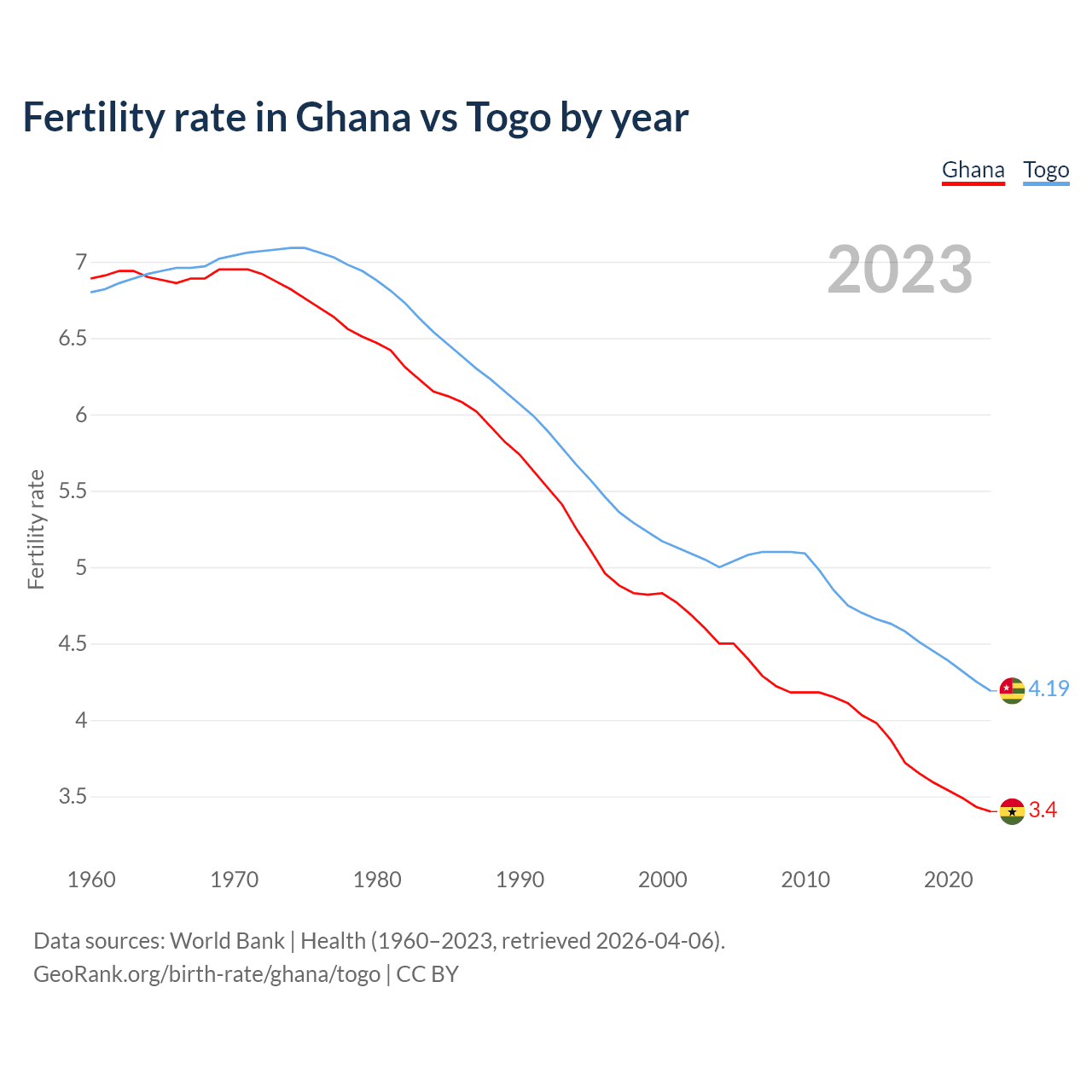 1960 vs 2023, the fertility rate has decreased by 50.7% in Ghana and by 38.3% in Togo — in 1960, it was 6.89 and 6.8, respectively.