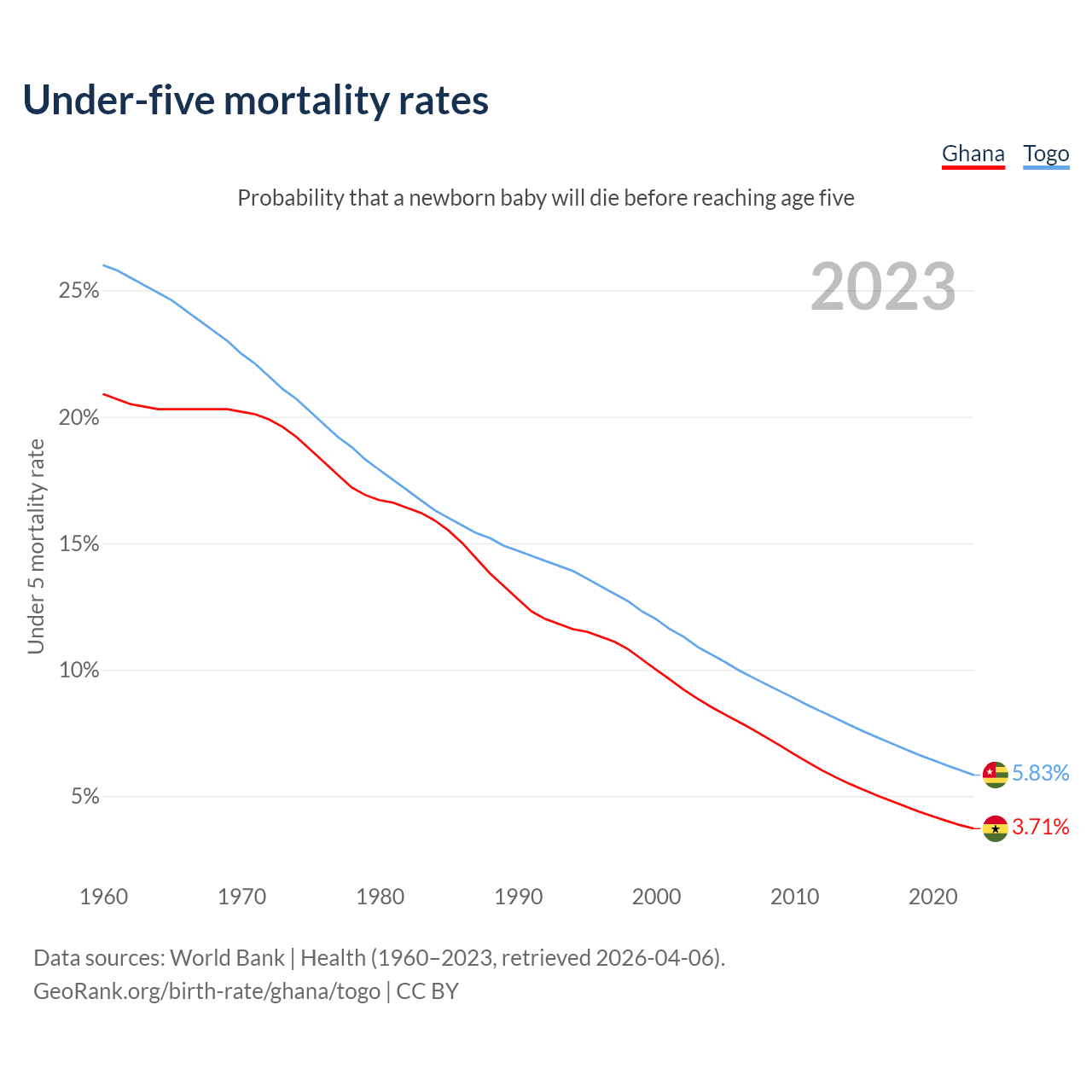 The chance that a newborn baby will die before reaching age five is 3.71% in Ghana and 5.83% in Togo. Above is a chart with historical data on under-five mortality rates.